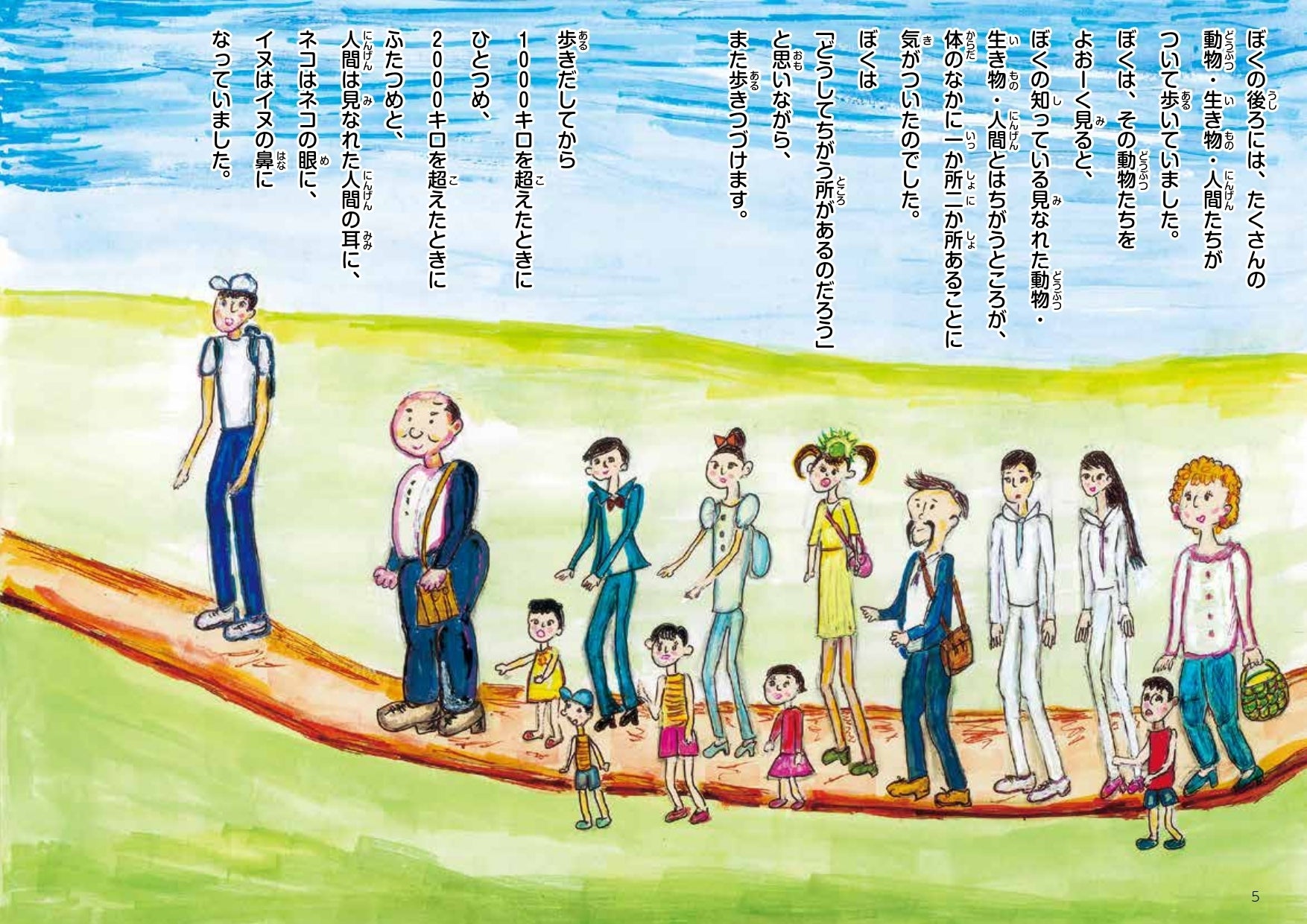 絵本に登場する「一風変わった生き物たち」も自分の足で歩いていると、自分のペースを取り戻し、自然と「見慣れた姿に戻っている」というお話しです。