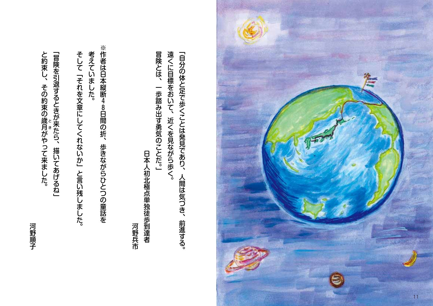 この絵本は「縦書き」になっております。なぜ縦書きかというと、父は北極点から地元愛媛県を目指して歩いておりました。つまり、「北から西(右⇒左)」に歩きます。