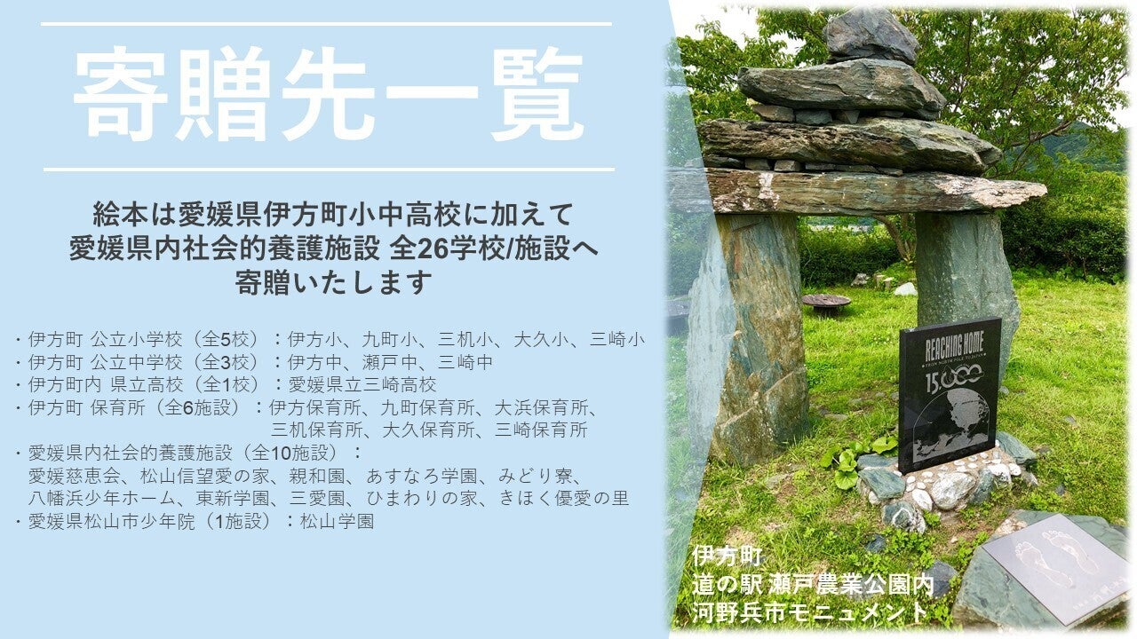 ご支援いただいた皆様には、リターンとして絵本『おうちへ帰ろう』をお渡しいたします。そして、支援金をもとに絵本『おうちへ帰ろう』を制作し、父が生まれ育った愛媛県伊方町の小中高校、保育所、愛媛県内社会的養護施設へ約700冊を寄贈するというチャレンジになります。