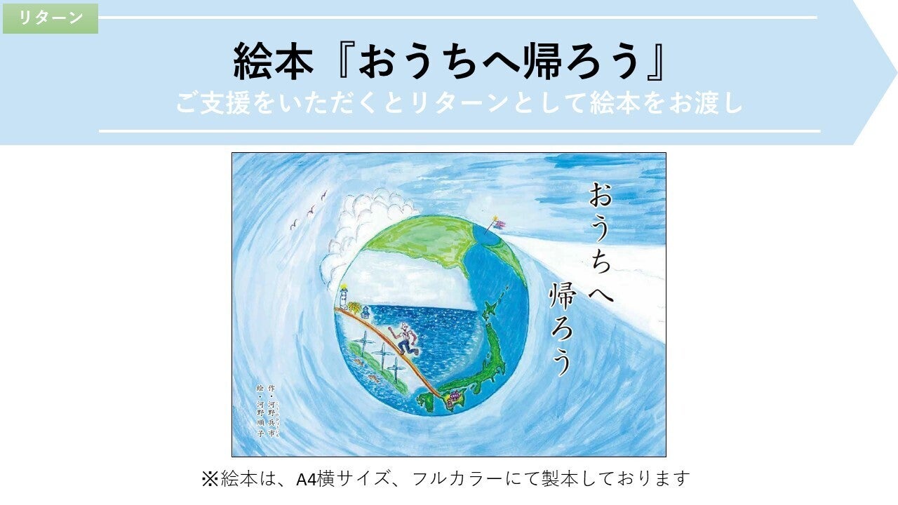 本プロジェクトへご支援いただいた皆様には、リターンとして絵本『おうちへ帰ろう』をお渡しさせていただきます。