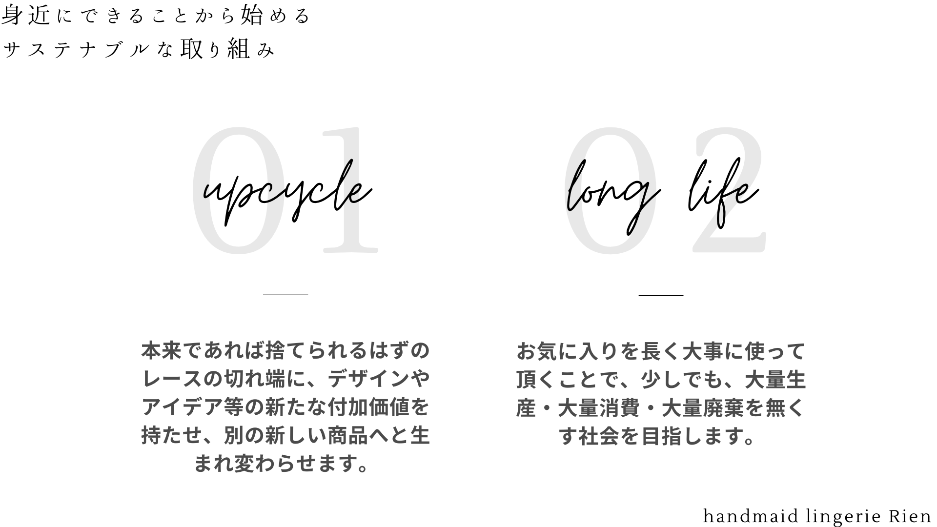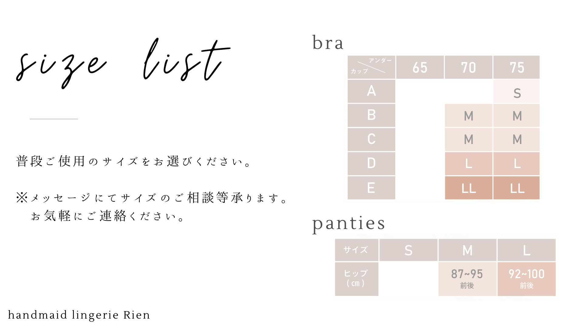 衣類は、時間や思い出を記憶する媒体と考え、お客様だけの時間や思い出を Rien のランジェリーに記憶し、特別な意味をもたせて頂くことをコンセプトに、ノンワイヤーのハンドメイドランジェリーの製作・販売を行っております。