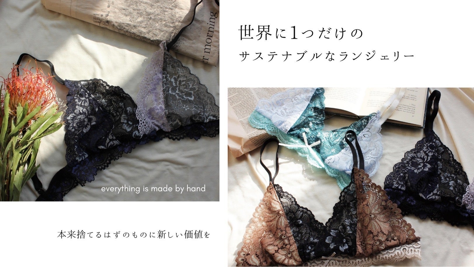 ※世界に一つだけ、とは現在までのRienの商品やサンプル製作で使用したレース(手染め済の物を含む)の残資材だけを使用し、組み合わせて出来たオールハンドメイドのランジェリーのため、デザイン、配色、サイズ、リボンの有無等、全てが同じ商品が生まれることは無いということです。