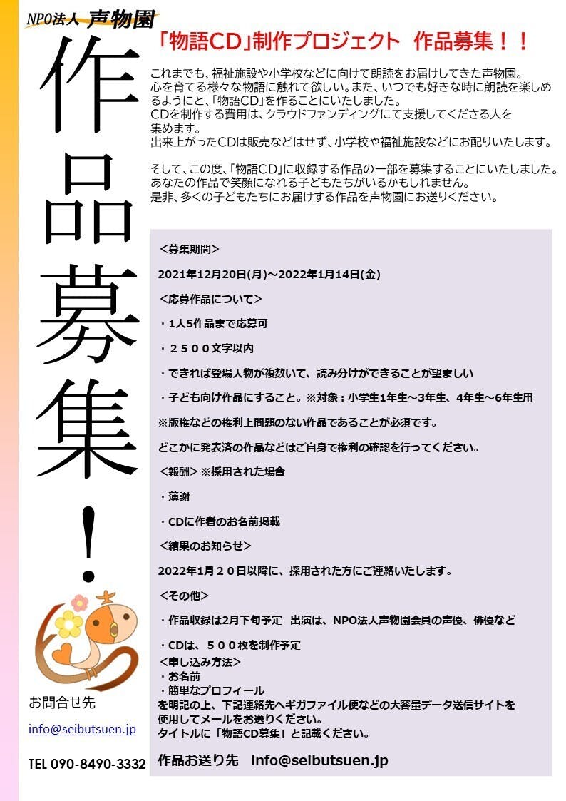 制作する物語CDに収録する物語の一部作品を一般募集しています。