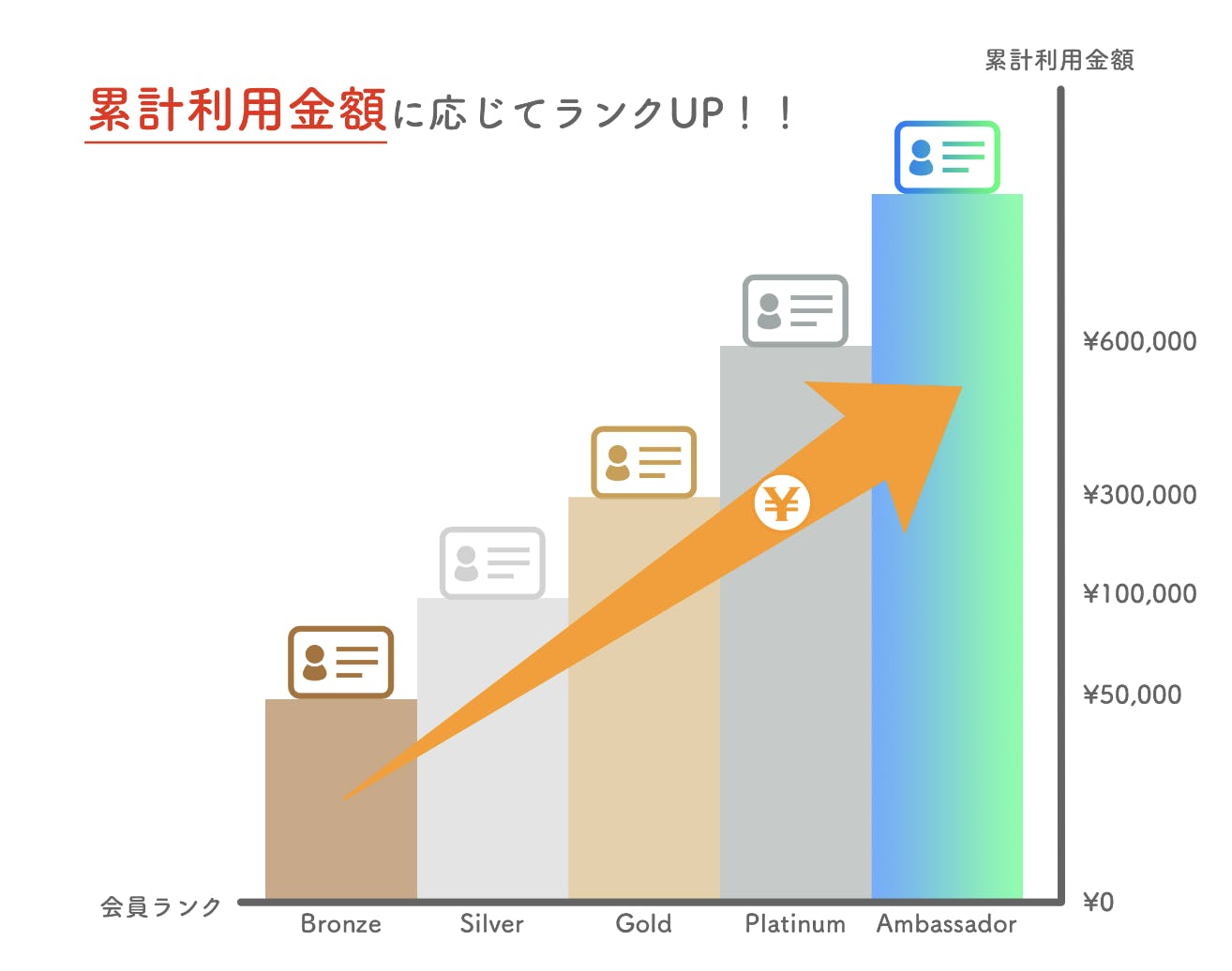 累計利用金額に応じて会員ランクが上がるシステムとなっております。