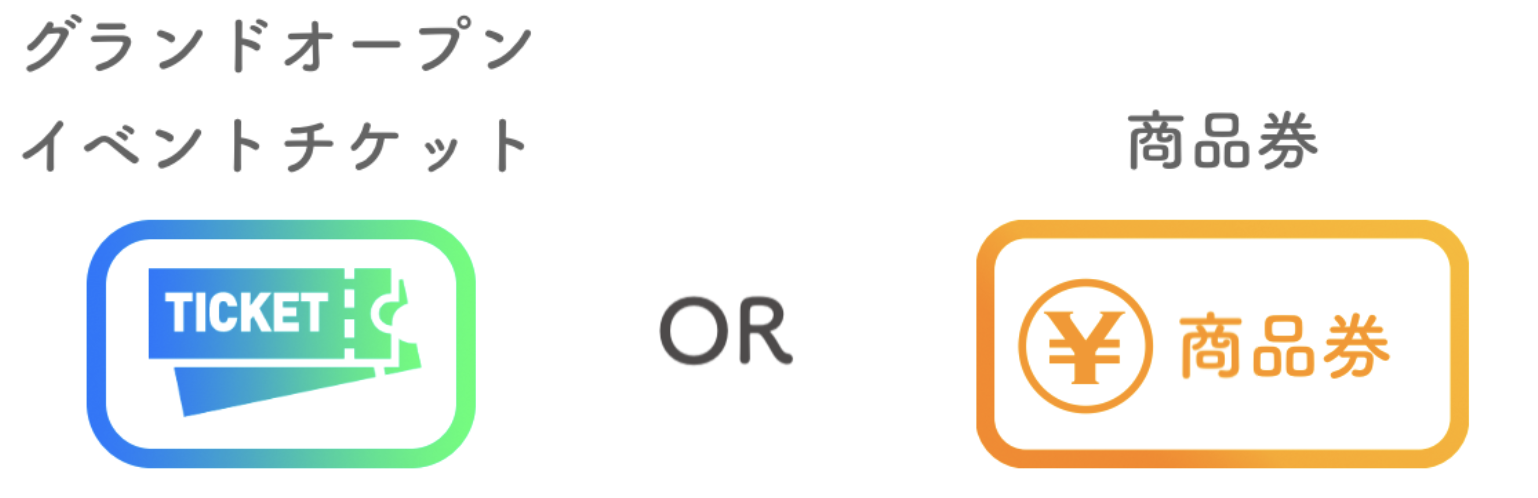 グランドオープンイベント(Day1、2に分けて開催)の1dayチケットまたは、オープン後にご利用いただける商品券を付与いたします。