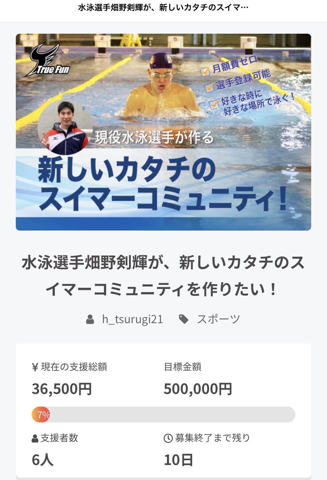 2022/03/20 20:00皆様こんばんは、クラファン掲載終了まで残り10日となりました‼︎今現在6名の方にご支援を頂きました。ありがとうございます。開始当初はご支援数を多く頂けていましたが今は伸び悩んでいます。スイムチームを運営するとことに対し中々ピンと来ないかと思いますが、第一は皆様のご支援が合ってこそだと感じております。引き続き皆様のご支援よろしくお願い致します。 もっと見る