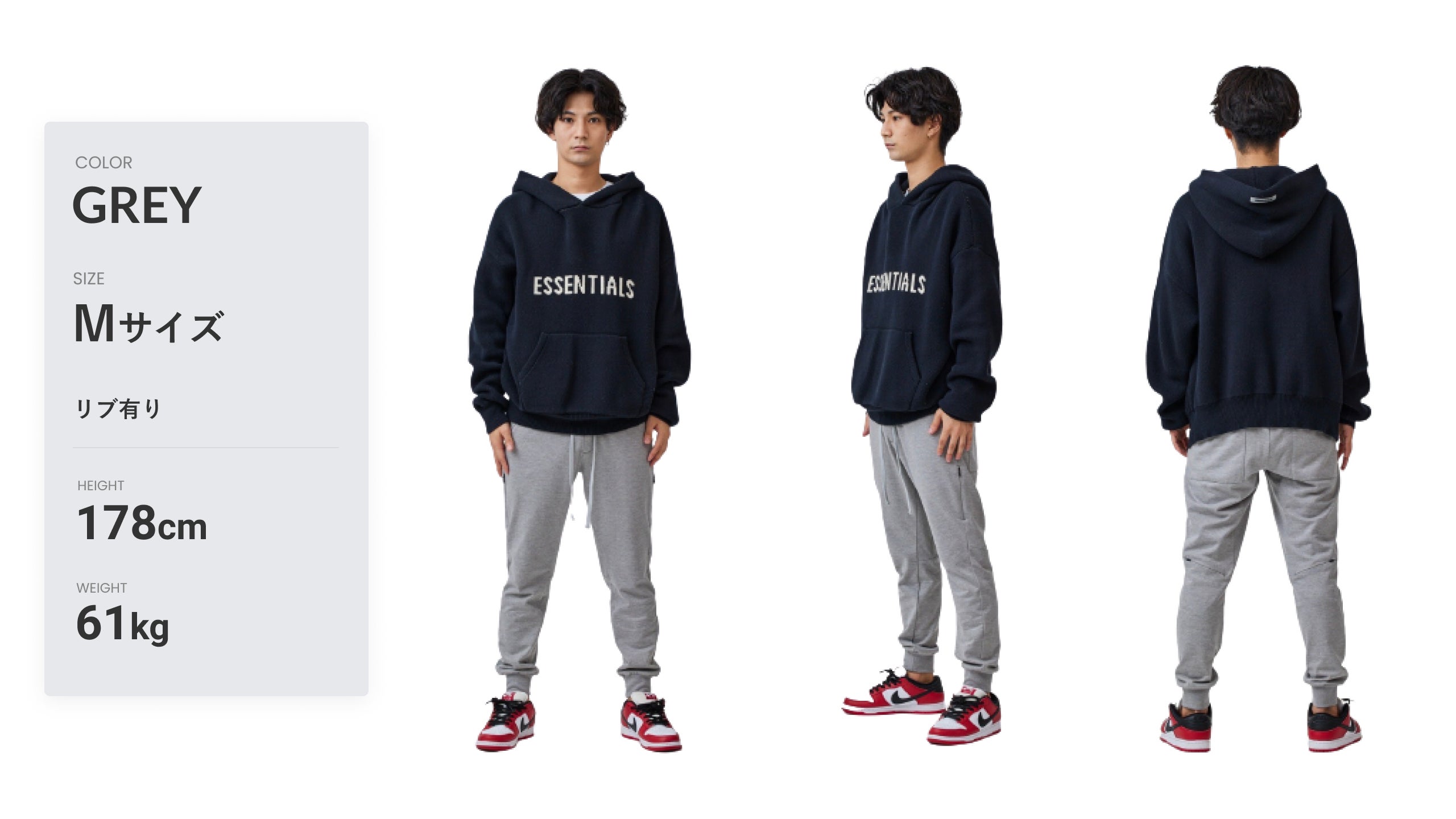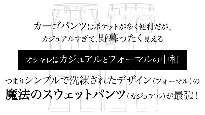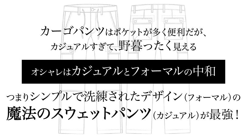 ④ 部屋着っぽい→『日本製の高級素材』と『スマートな脚長シルエット』で、清潔感のある大人のスタイルに!