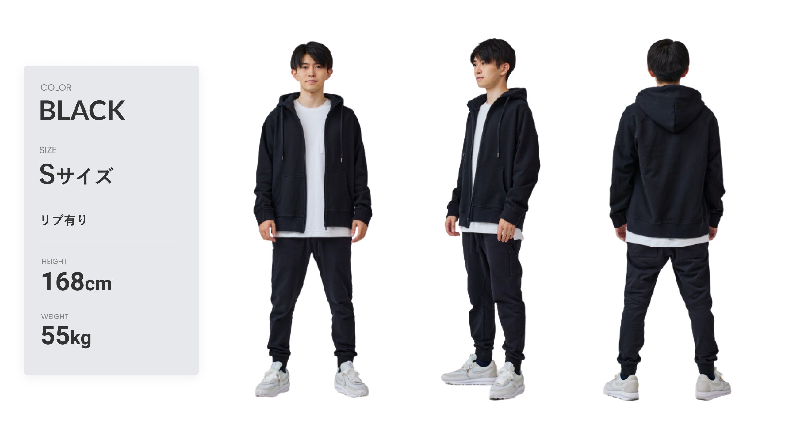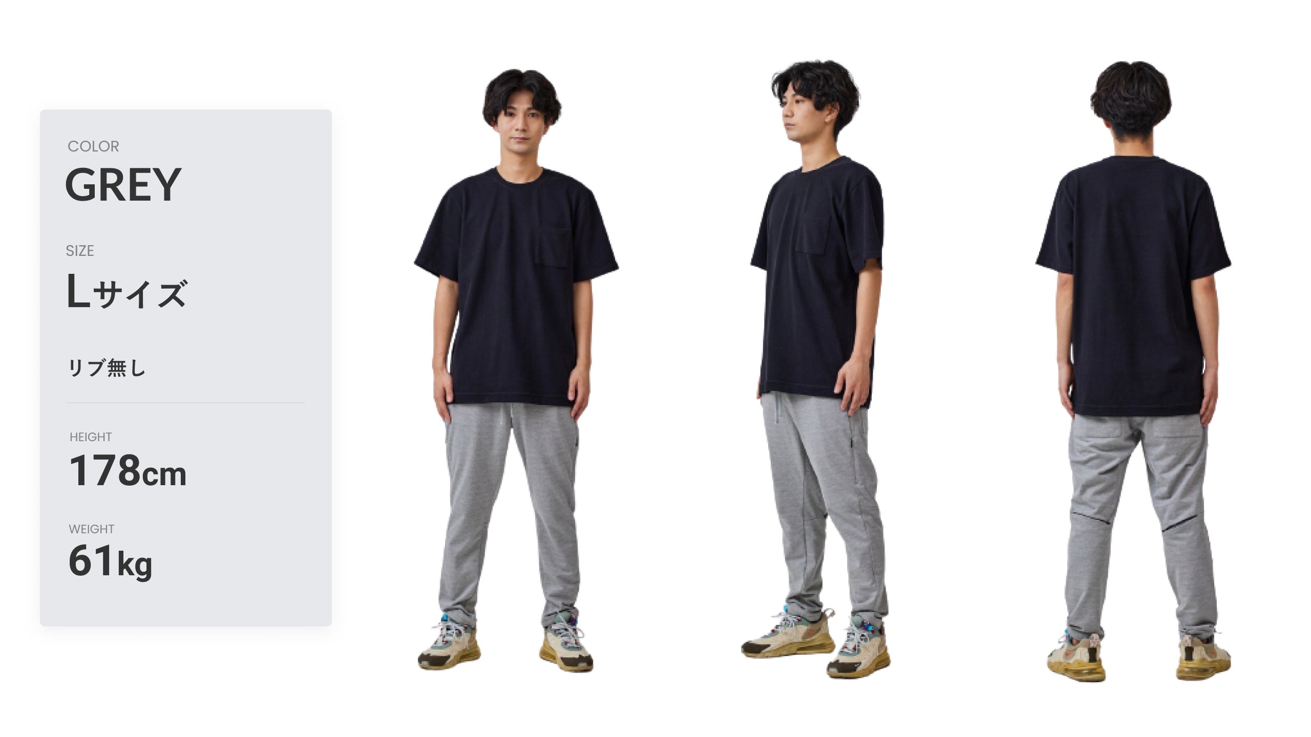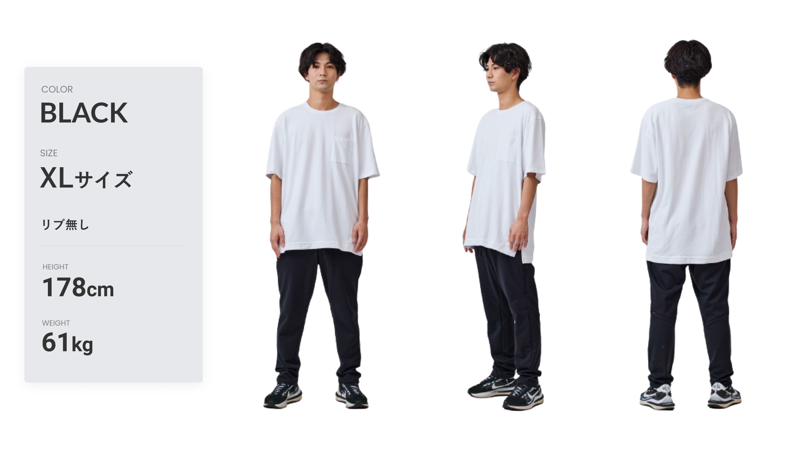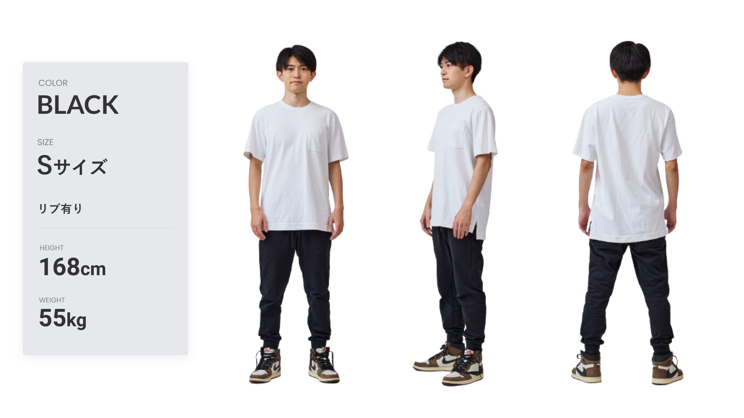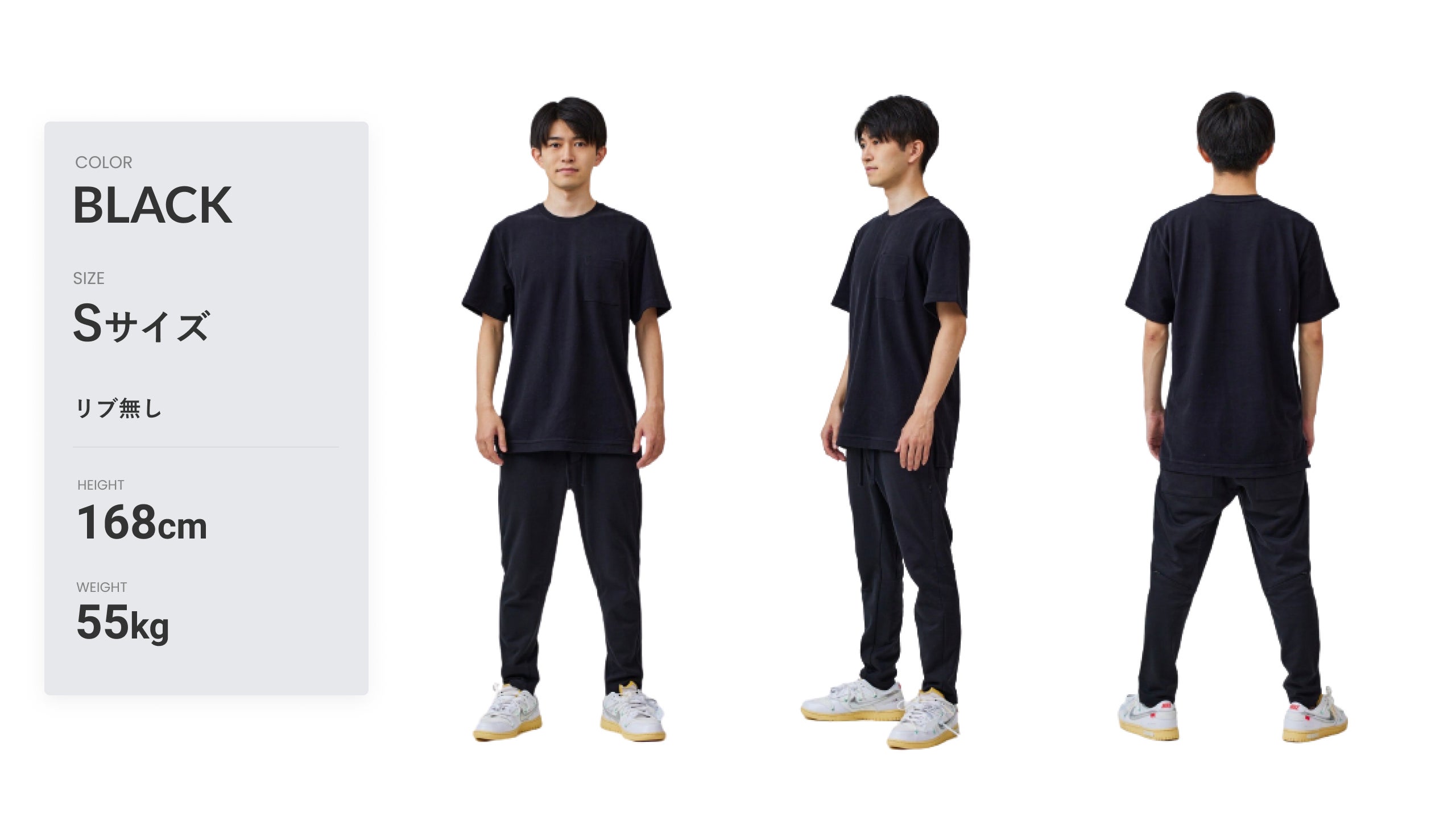 上記写真:170cm、60kg男性がリブ無しSサイズ着用