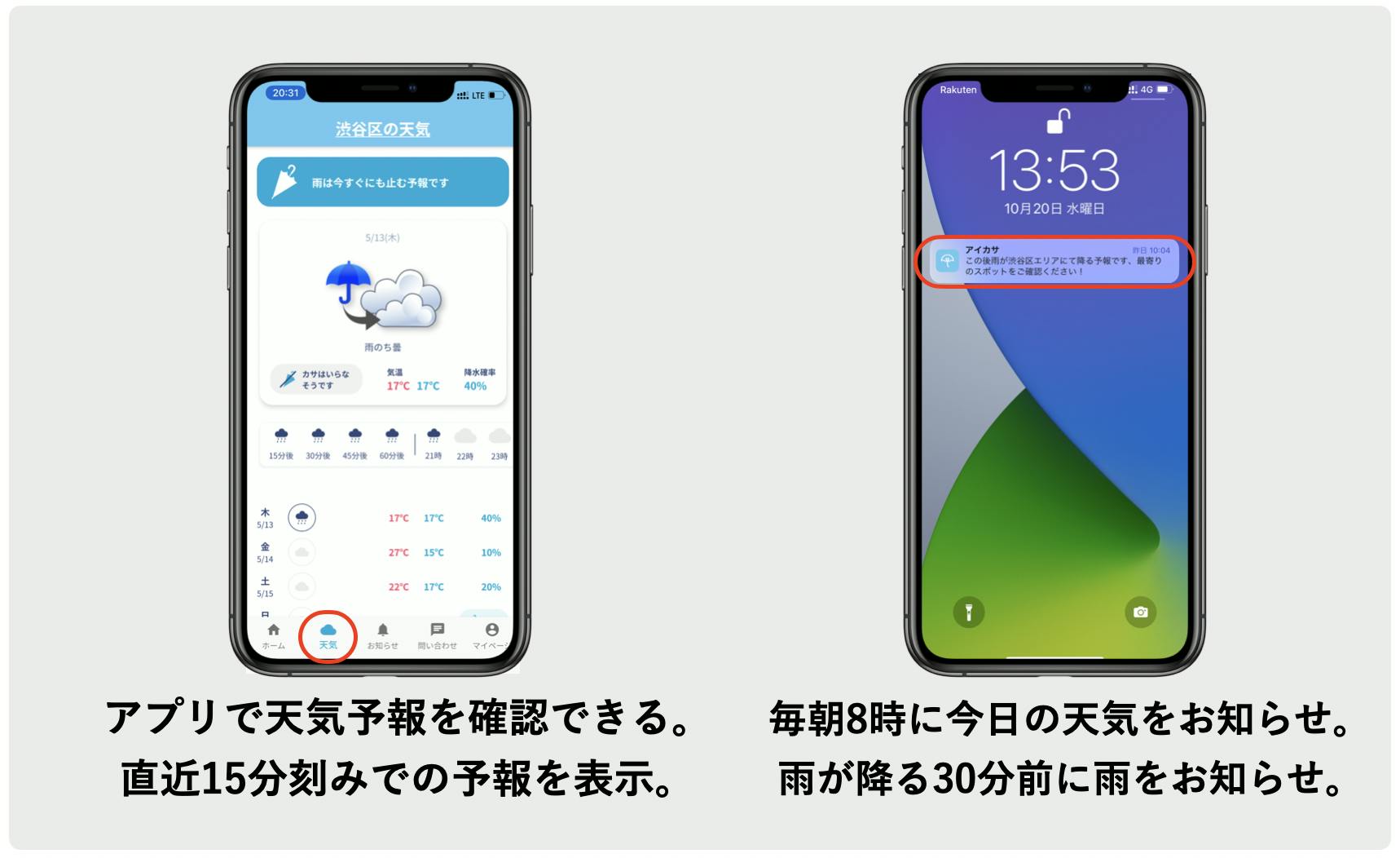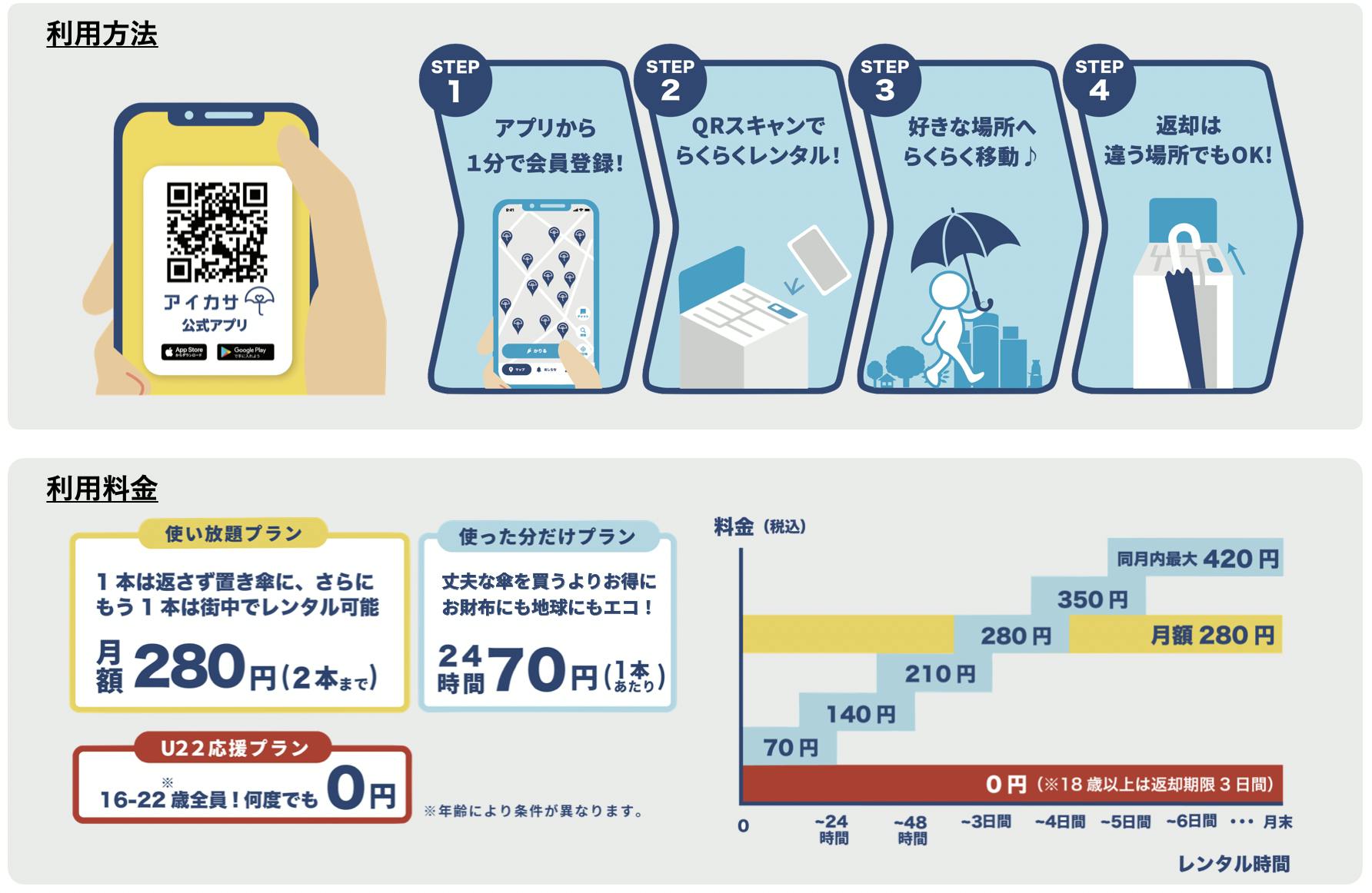 アイカサはスマホ1つで街中の傘をレンタルできる、傘のシェアリングサービスです。