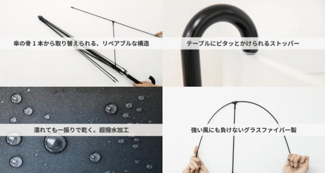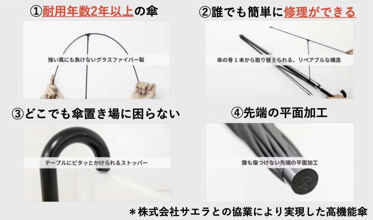 アイカサはシェアすることで無駄な傘の消費を抑えますが、シェアだけではなく丈夫で多機能、さらに修理可能なリペアブル仕様となっています。1本の傘が壊れにくく、たとえ壊れても骨1本から修理可能で無駄にならない設計なんです。