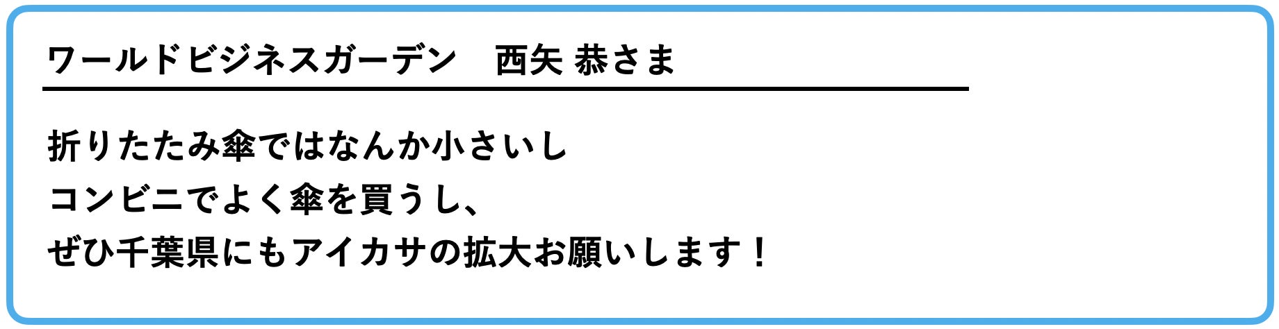 300人の方が積極的にアイカサをご活用頂きまして、家族や、パートナー、友人、職場の同僚さまざまな方にもこのシェアリングの輪を広げていくことにより社会の当たり前が変わっていきます。