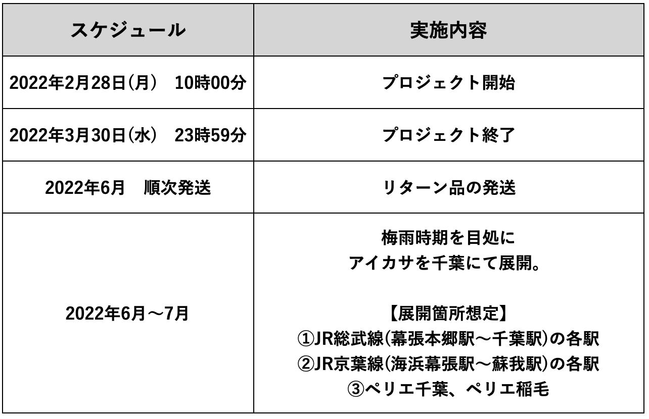 【資金の使い道】ご支援いただいた資金は、千葉県で展開する予定のアイカサの製作費、リターン品の購入・発送等経費、クラウドファンディング手数料に使用させていただきます。