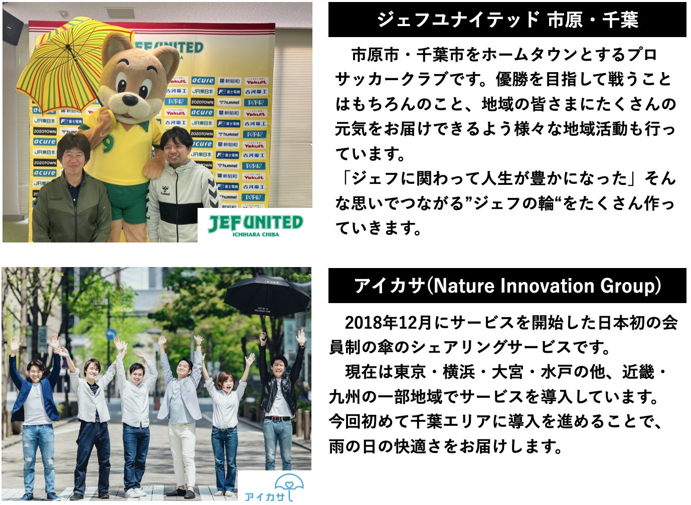 そんな思いを持ったJR東日本千葉支社・ペリエ・ジェフユナイテッド・アイカサ の4社で、日本に広がりつつある傘シェアを千葉にも導入すべく今回のプロジェクトを立ちあげました。