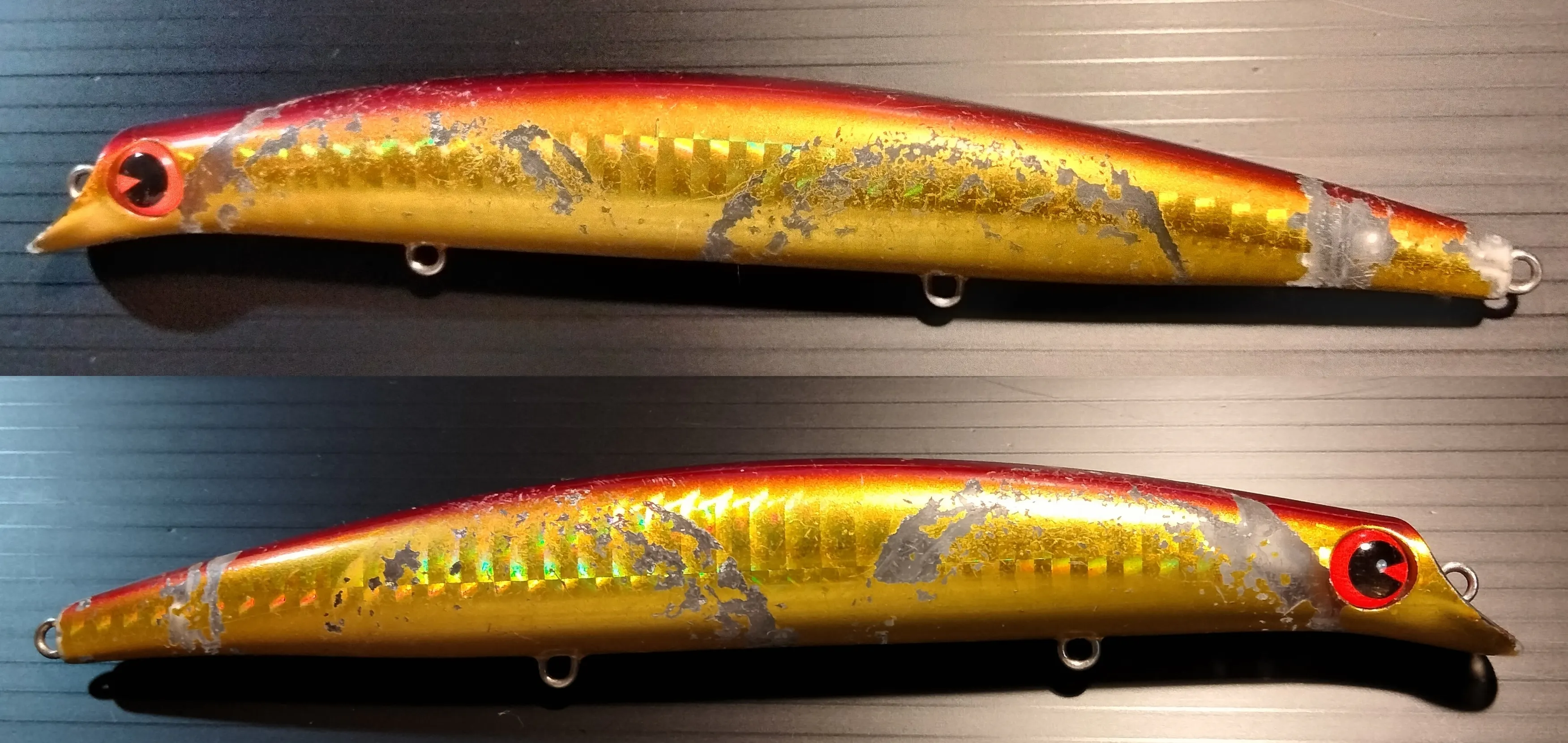 投げるとき、水中でアクションするとき、移動時にルアーケースの中でついた傷です。