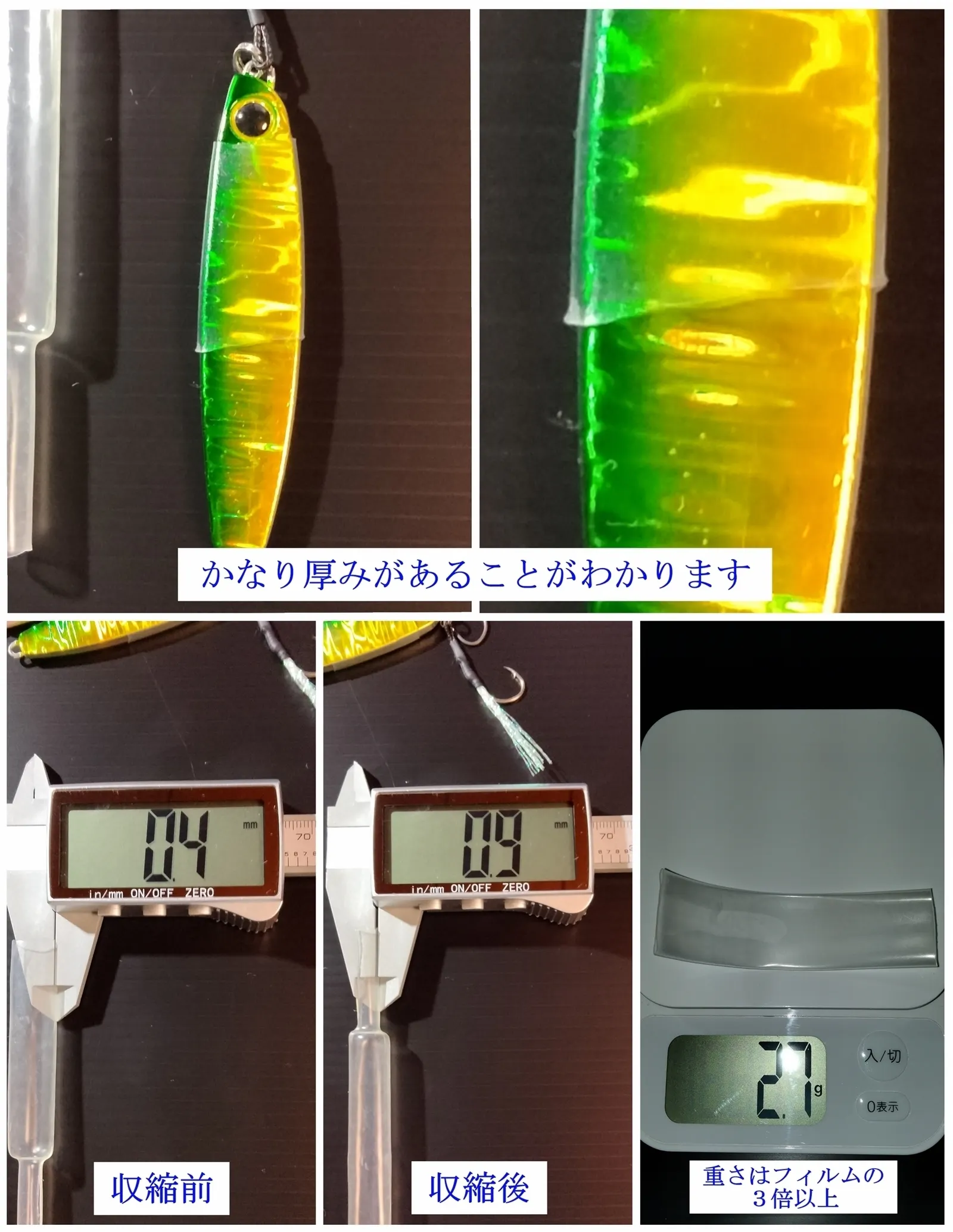 シュリンクフィルムの厚さは0.08ミリ、同じ長さで0.8グラム明らかに違います。