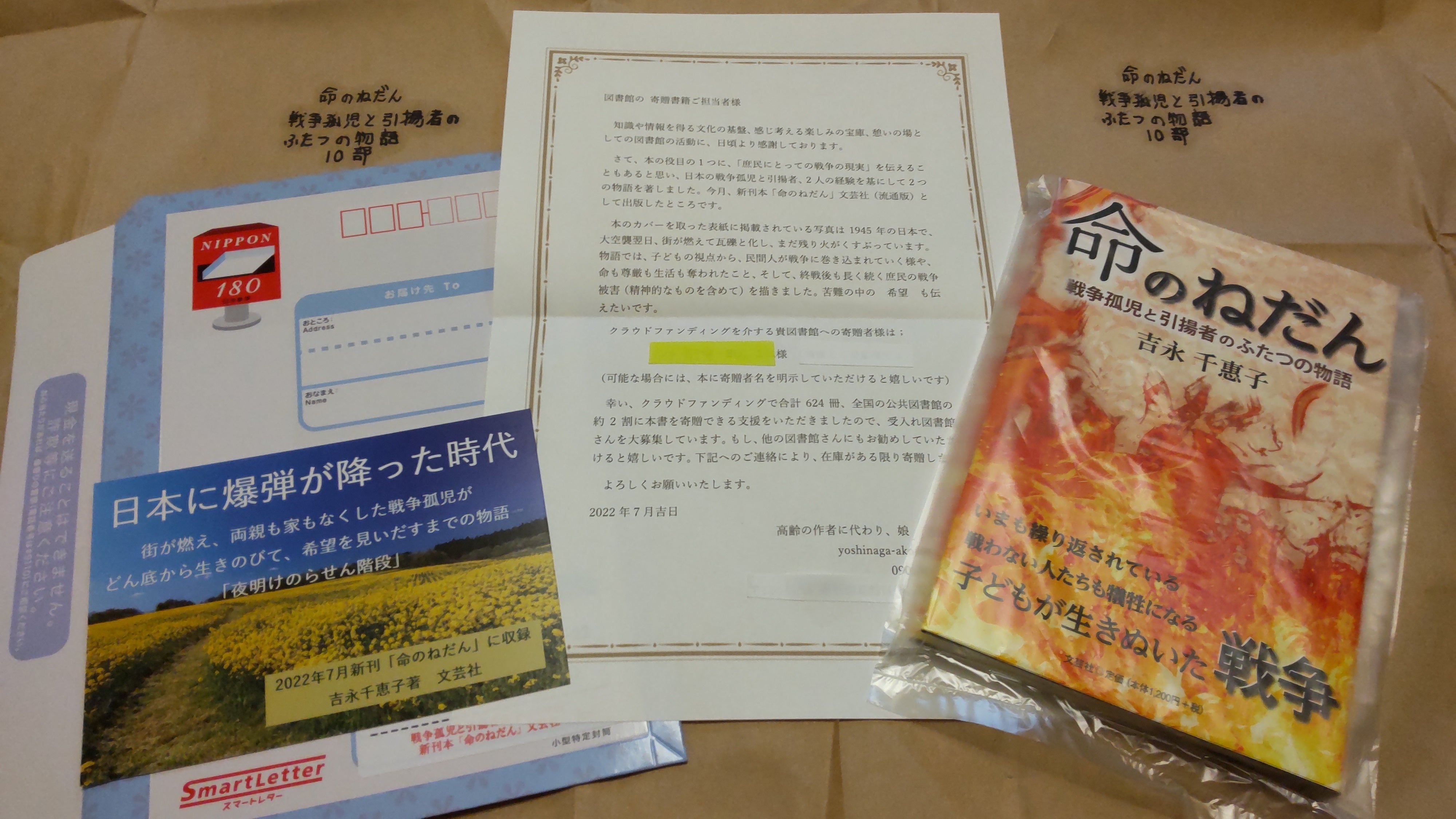 2022/07/03 18:04温かい応援と貴重なご支援をありがとうございました。母と私の思いに賛同してくださったことは、とても大きな励ましになりました。加えて、温かい応援メッセージをありがとうございました。93歳の母は感動して泣き、自分の生きる意味を見いだしていたように思います。私もまた大いに励まされ、最後まで頑張り通す元気をいただきました。心より感謝しております。ご支援にも深く感謝しております。本の制作費だけでも予定の倍額、一大決心でしたので、新刊のうちに本書を図書館に寄贈することは、自分一人では、とてもできなかったです。なお、掲載した図書館さん全てに本書をお送りしておりますので、ご安心ください。ご厚意に、深く感謝しております。ありがとうございました。2022年7月3日 吉永 亜子 もっと見る活動報告 5 図書館への寄贈の3点セット