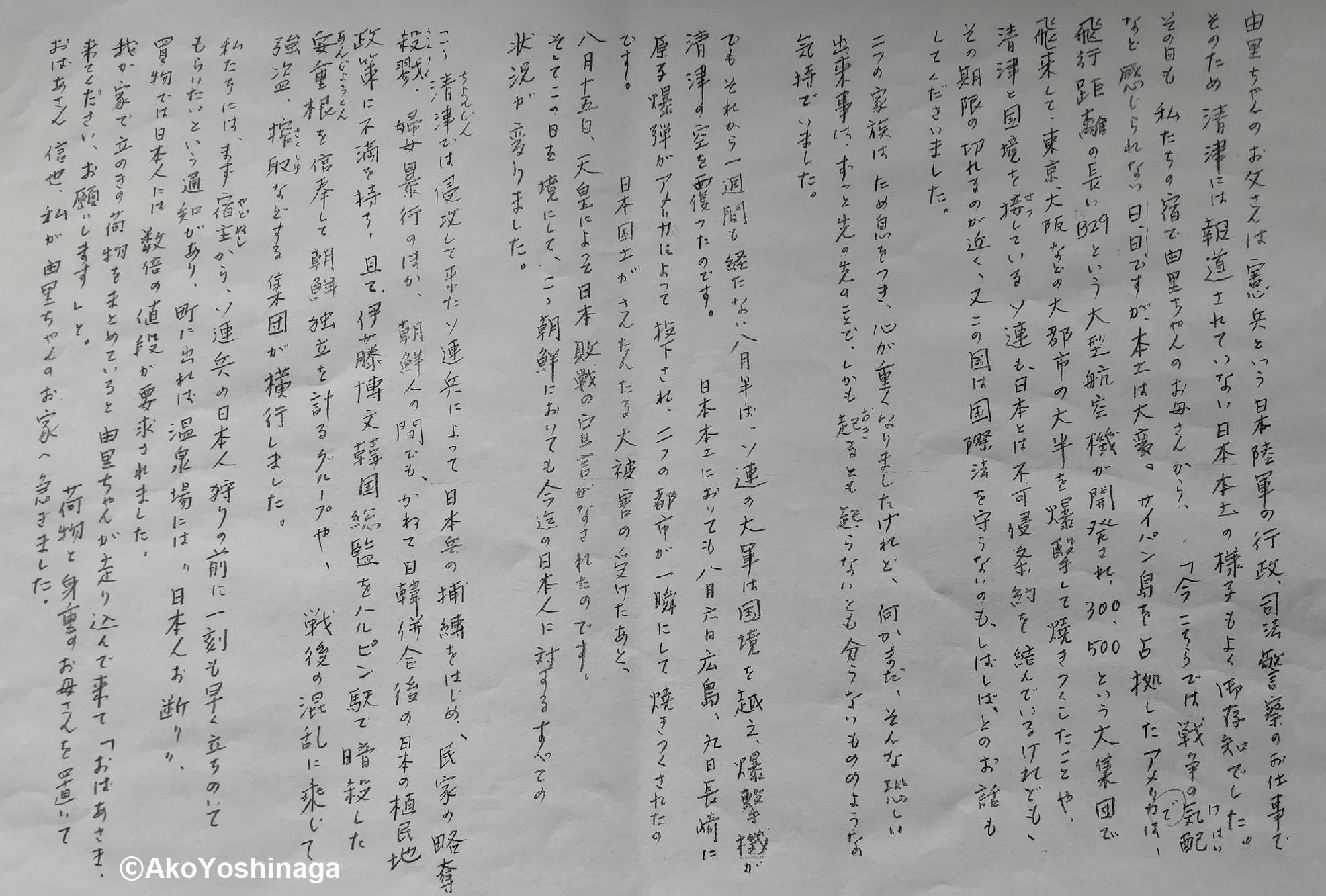 92歳は、短い余生で自分が “これからの人たち” に貢献できることを考えました。“みんなに幸せでいて欲しい。そのために平和を守りたい” そのために自分ができることは、戦争が(戦場にいない)私たちに与えた影響を伝えることだ、と。それで、使命感を感じて2つの物語を書きました。“戦争のことを知れば平和の大切さがわかる。ひとりでも多くの人に知ってもらいたい” これが作者の悲願です。
