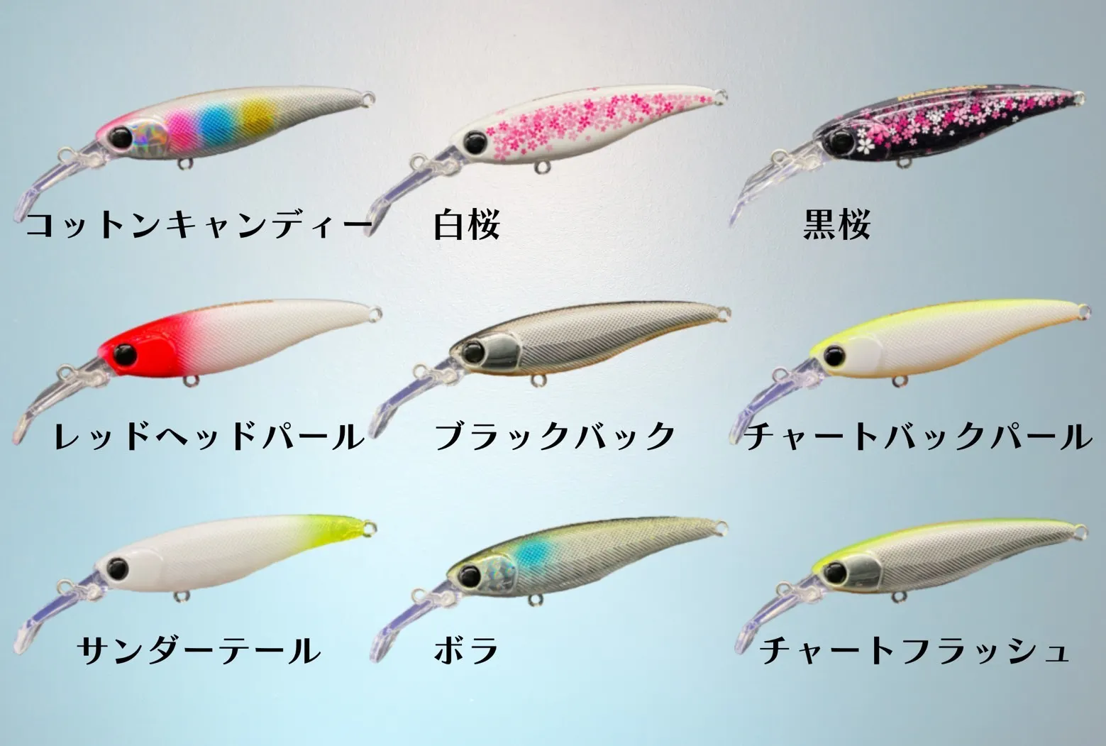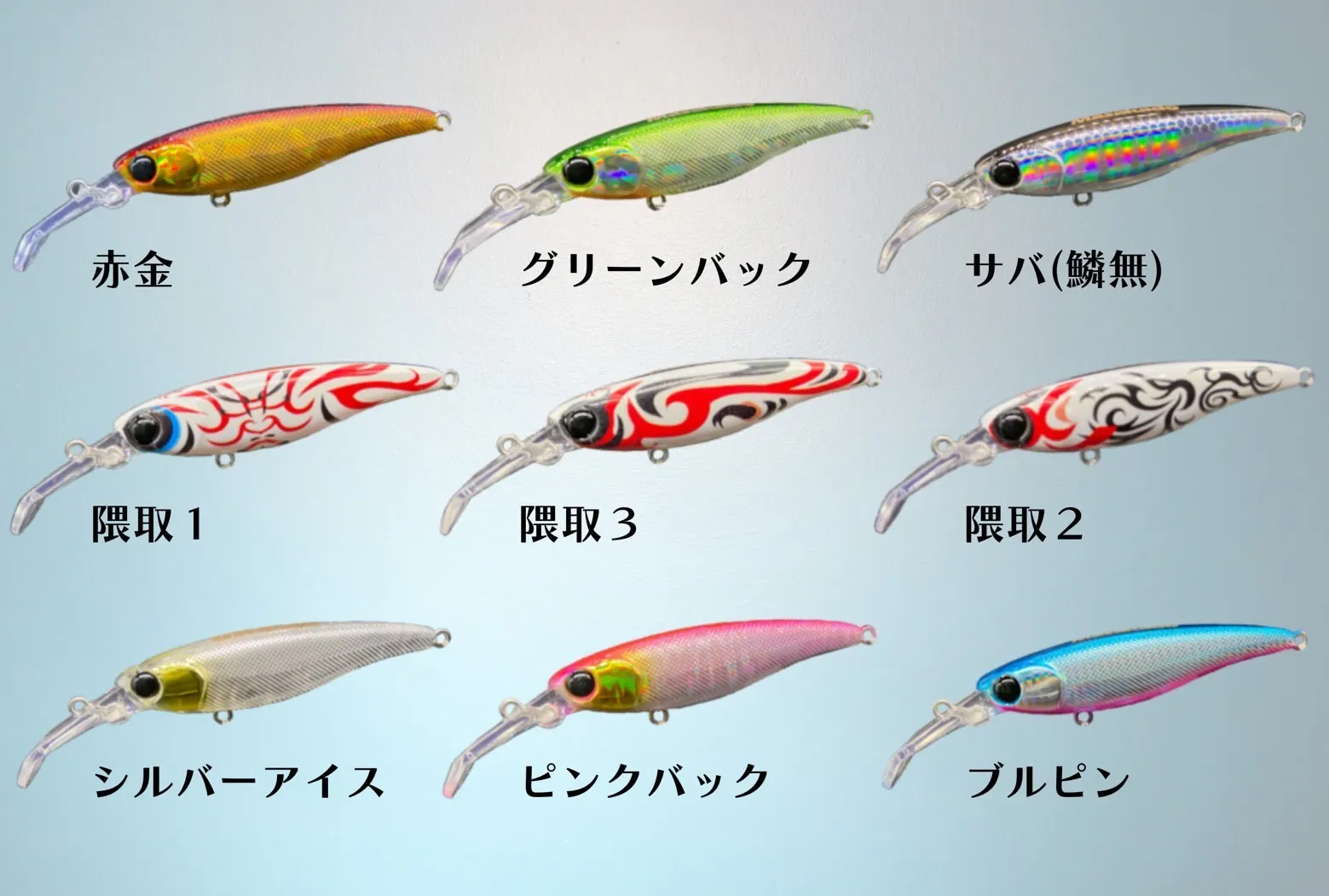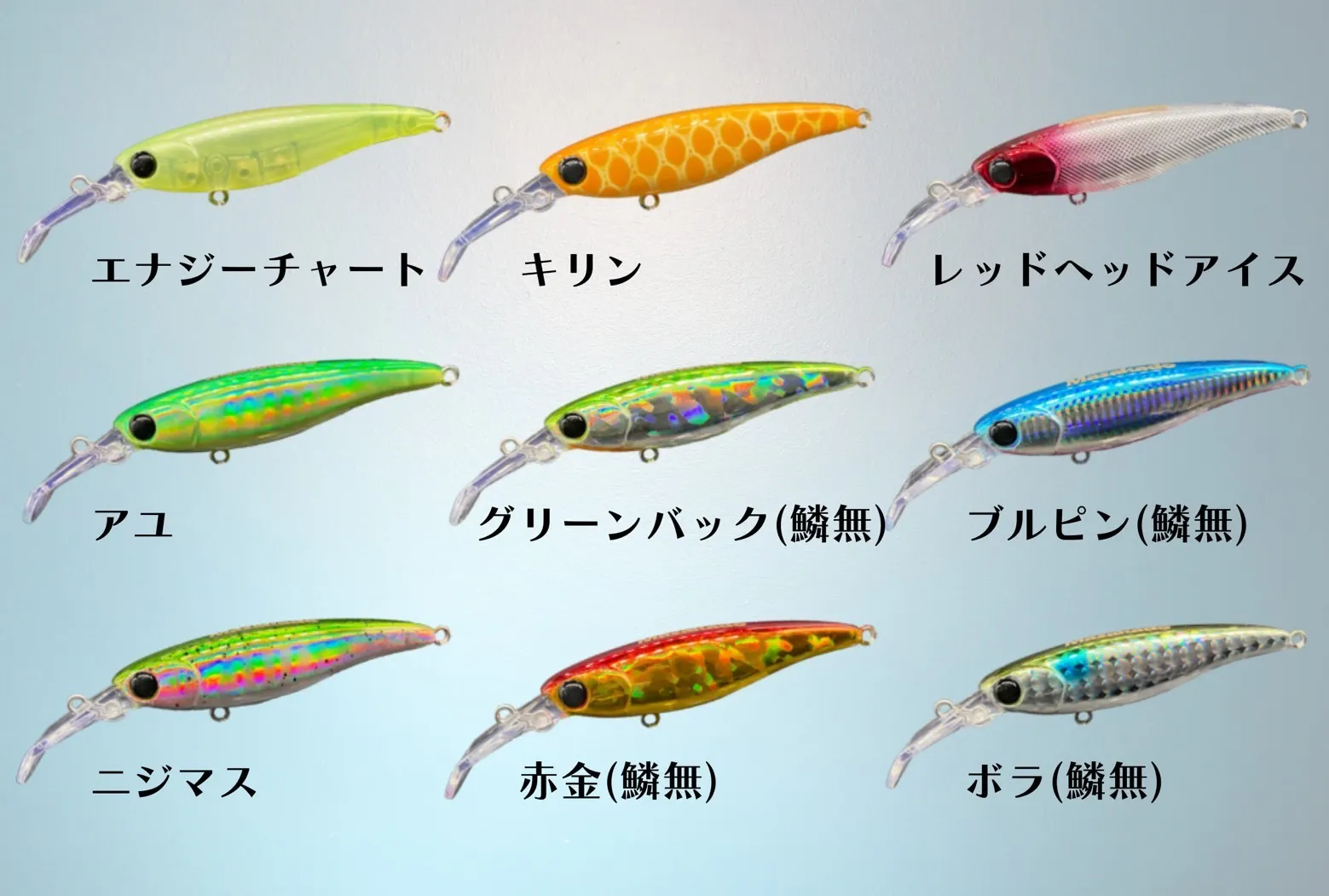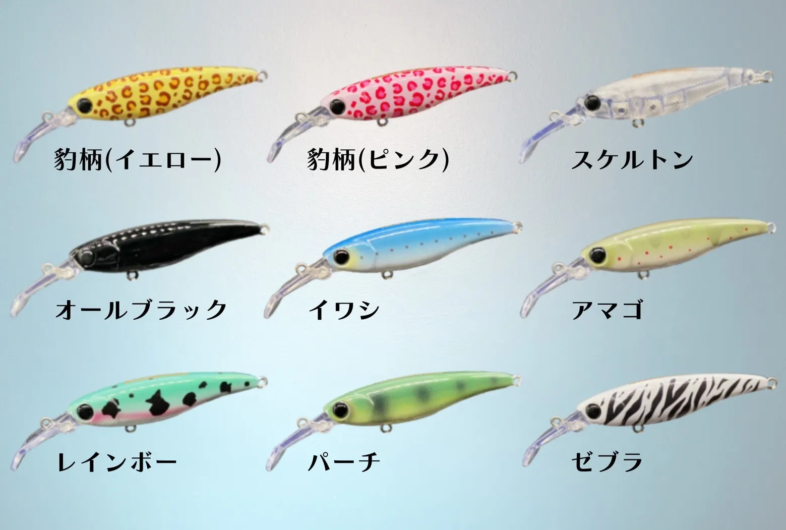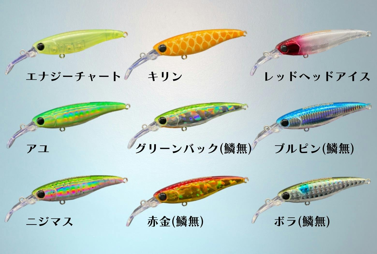 デザインは3Dインクジェットを利用した、精密なグラフィックを再現したものと、吹き付け塗装の2タイプ。グラフィカルなルアーのビジュアルも個性を演出しています。