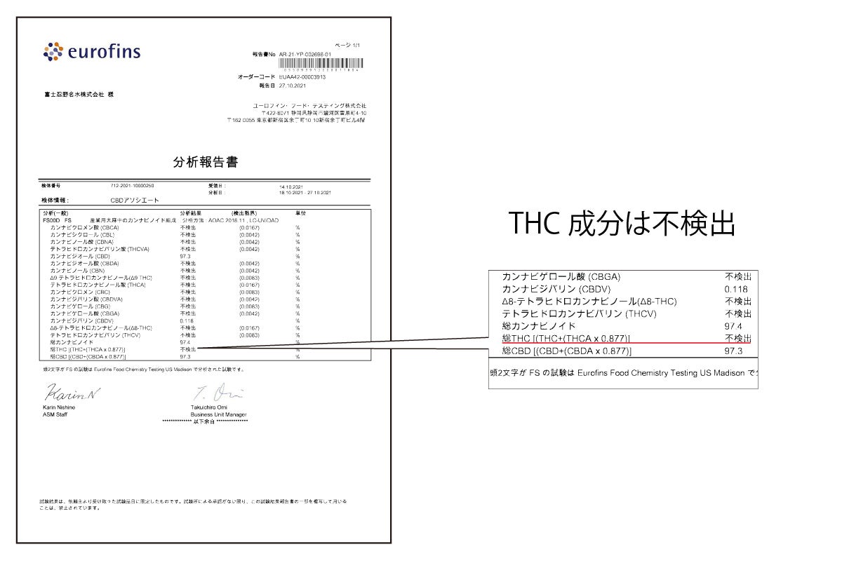 輸入したCBDアイソレートは、国内にて第三者機関に分析を依頼しました。日本では禁止成分とされているTHCが含まれていないことを証明する「不検出」です。安心してご利用いただけます。