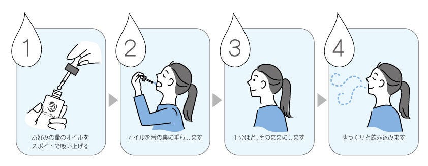 1日2回、付属のスポイトでボトル内のオイルを吸い上げて2〜3滴を目安に、しばらくお口に含んだ後、お召し上がりください。