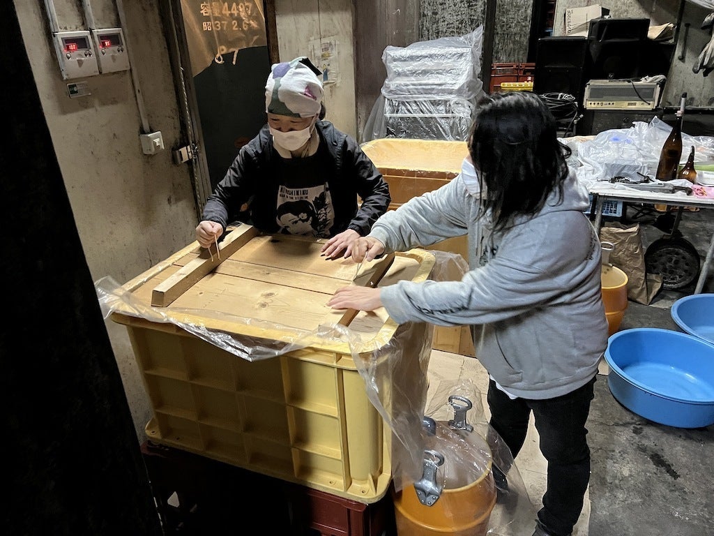 右から、三芳菊酒造杜氏の馬宮社長と宇高さん、Farm19吉田代表理事