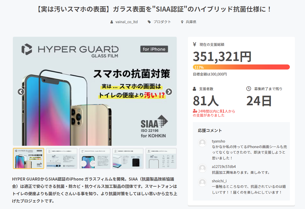 サポーターの皆様こんにちは、HYPER GUARD プロジェクトチームです。サポーターの皆様のご支援のおかげでプロジェクトスタート初日で目標金額達成いたしました!ご支援いただいたすべての方に、スタッフ一同心より感謝いたします。本当にありがとうございました!現在、コロナ禍に加えて冬のインフルンザ・風邪などの流行期を迎え、ますます身の回りの抗菌・除菌に対するニーズが高まっています。 スマートフォンは今や生活必需品といってもよいアイテムですが、実は画面に付着する菌の数はトイレの便座よりも多いという報告もあるほど。いくら手指消毒をしても、スマホの画面上にある菌を触れば除菌の効果もありません。日本国内の厳しい抗菌基準「SIAA認証」を取得した抗菌ガラスフィルムが、スマホ表面に付着した菌の増殖を抑制します。そんなスマホにも抗菌対策が有効だという事が分かり、今回のプロジェクトを立ち上げました。プロジェクトはまだまだスタートしたばかりですので、引き続きご支援いただけますようよろしくお願いいたします!