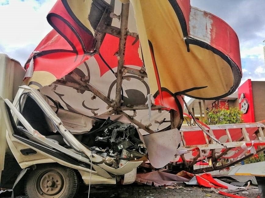 フィリピン発のファストフード店、フィリピン人のソウルフードとも言えるジョリビーの看板も倒壊し、周辺にも被害を及ぼしています。