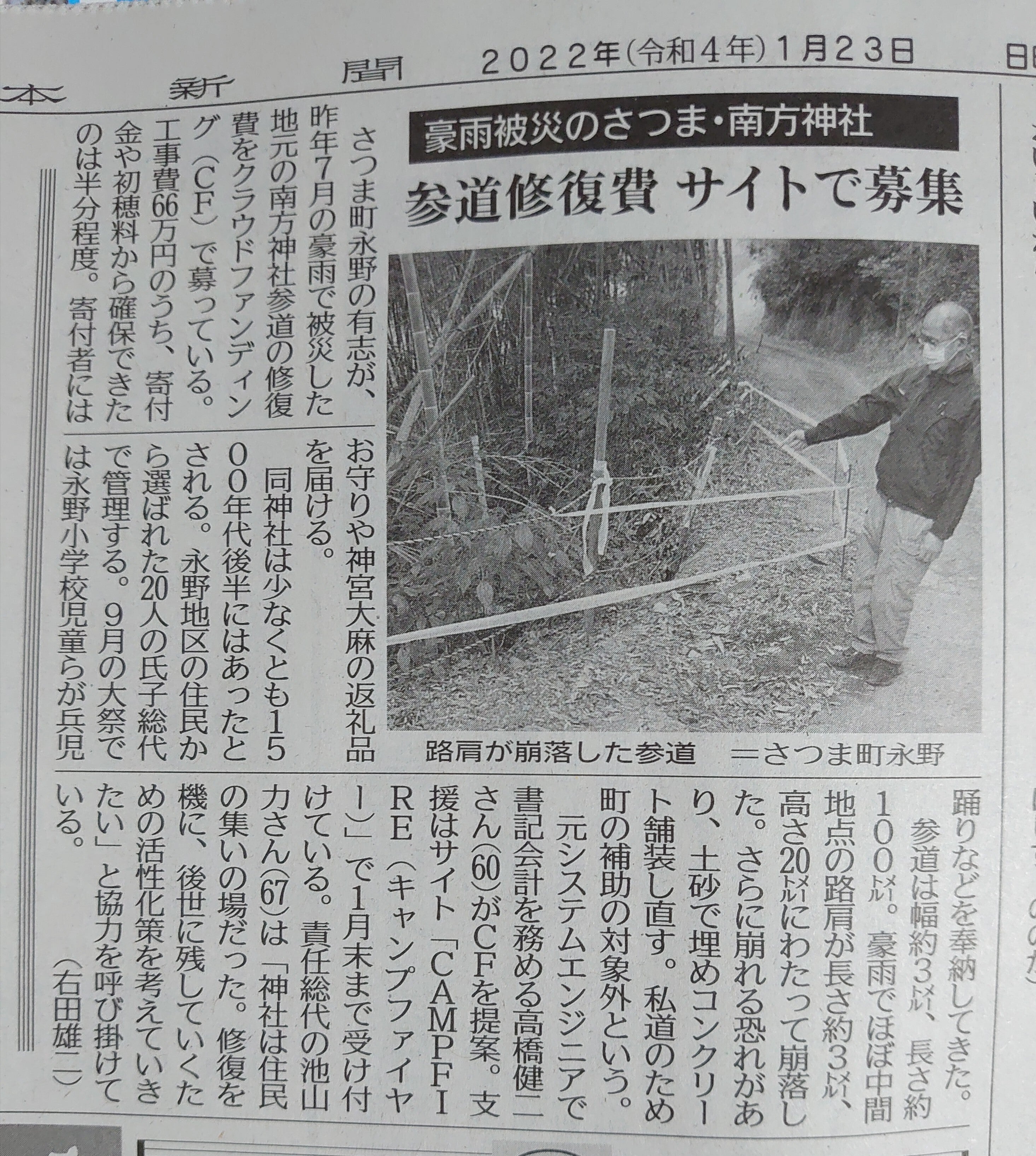 令和4年1月23日(日)の南日本新聞に、この度の南方神社の参道修復工事に係るクラウドファンディングの話題が掲載されました。広く皆様からのご支援をいただきながら、目標達成までもう少しというタイミングで新聞社からの取材を頂きましたことを幸いに思います。ひょっとすると、目にみえないところで大国主命がこのプロジェクトを暖かく見守って、そっと後押しをしてくださっているのではないかと、不思議なご縁を感じております。たくさんのご支援をくださいまして、誠に有難うございます。