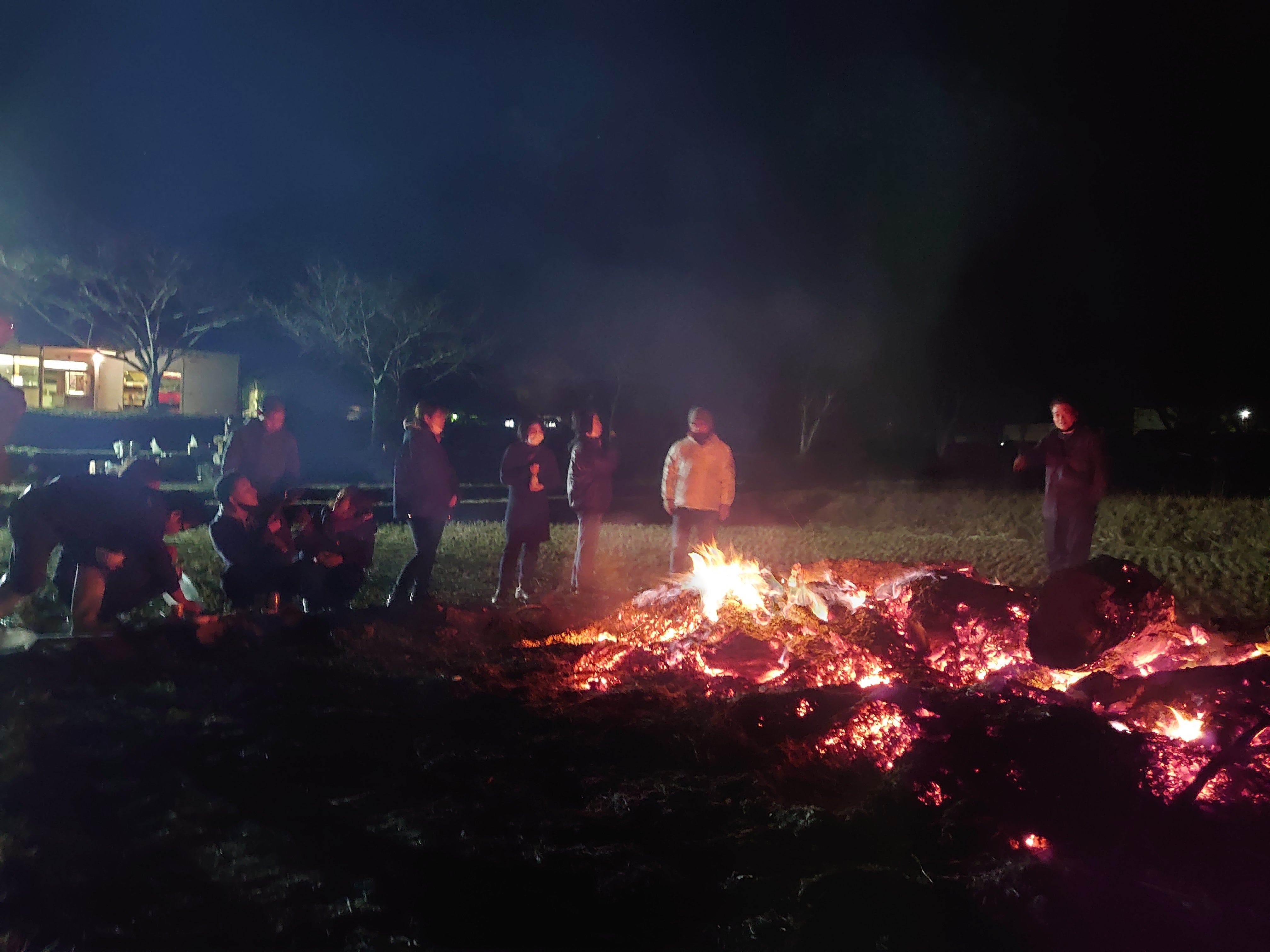 毎年1月7日前後に開催される年中行事の鬼火焚き(おにびたき)。さつま町永野では今年1月8日(土)の午後5時から執り行われました。南方神社と直接の関係はございませんが、神様仲間であられる田の神さぁ(稲の豊作を守護してくださる神様)の見守りのもと、無病息災を祈ってたくさんの人々が集まり、暗闇の中で燃えさかる炎を囲んで楽しいひと時を過ごしました。焚き火の炎で焼いたお餅や、豚の耳などを焼いて美味しく頂きました。新型コロナウイルスを禍と捉えることにとどまらず、幸せにつつまれた新たな生き方のきっかけとして新しい生き方を模索できればよいかなと思いました。