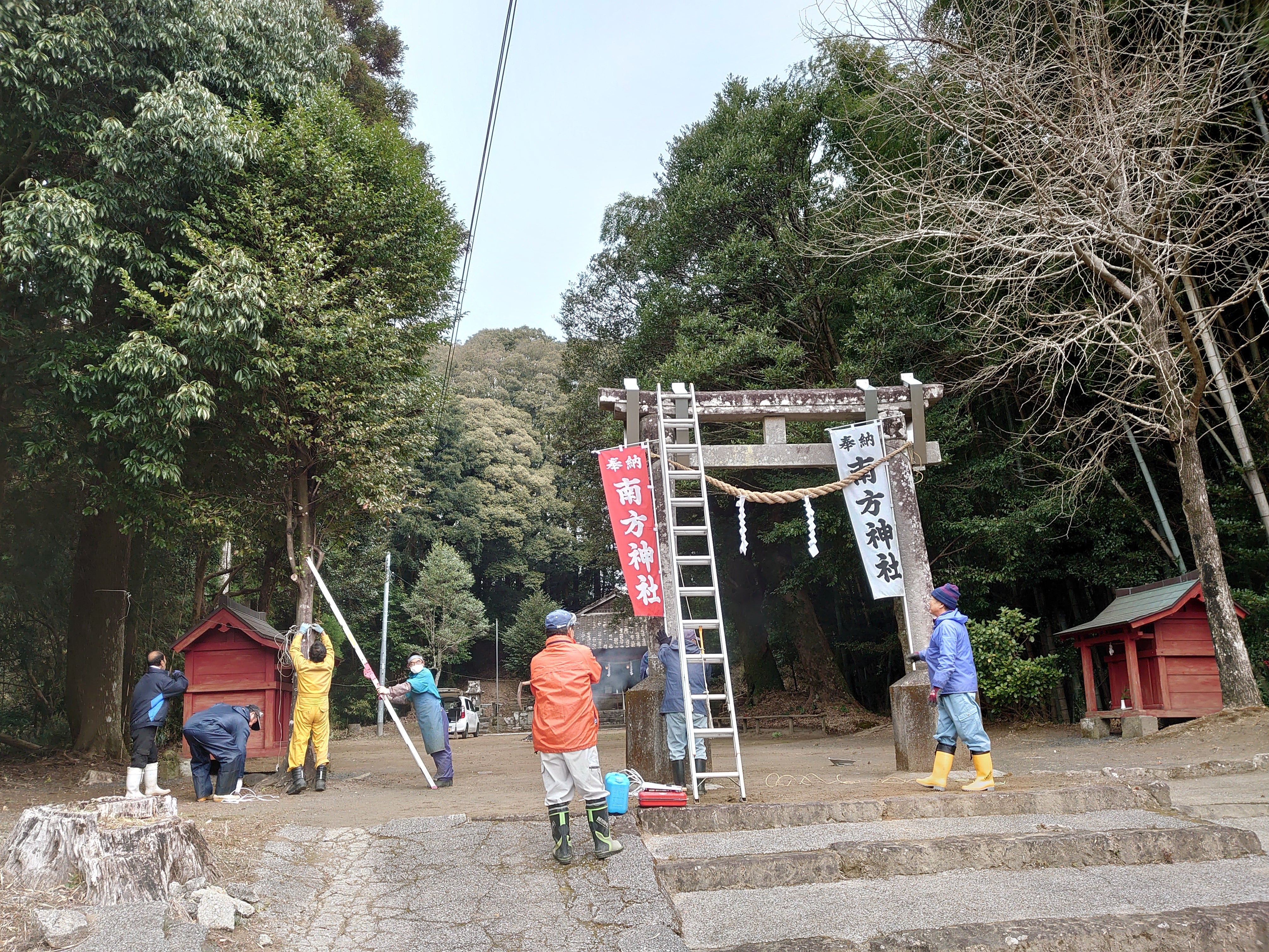 令和3年12月29日(水)の午前9時~11時頃まで、集落の総代13名で南方神社の初詣に備えた清掃作業を行いました。周辺の草払いを行い、参道と境内を掃き清めた後に、のぼりを立てて新しい年を迎えられるように準備します。しめ縄をくくり、灯りを灯す電線を張り巡らせて賑わいを醸し出します。