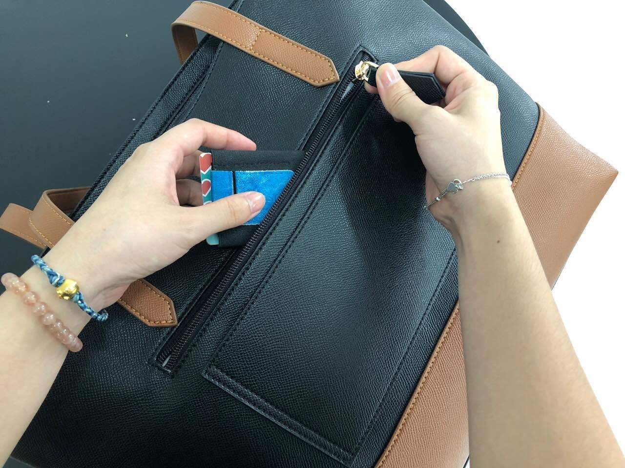 取っ手をつけることにより、中央のポケットはカードがすぐに使えるように設計しています。