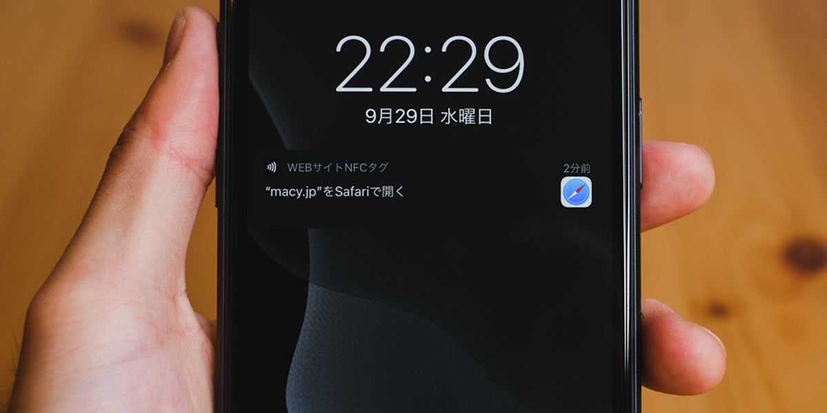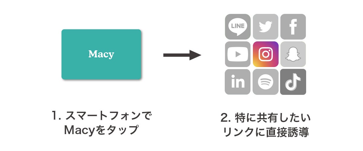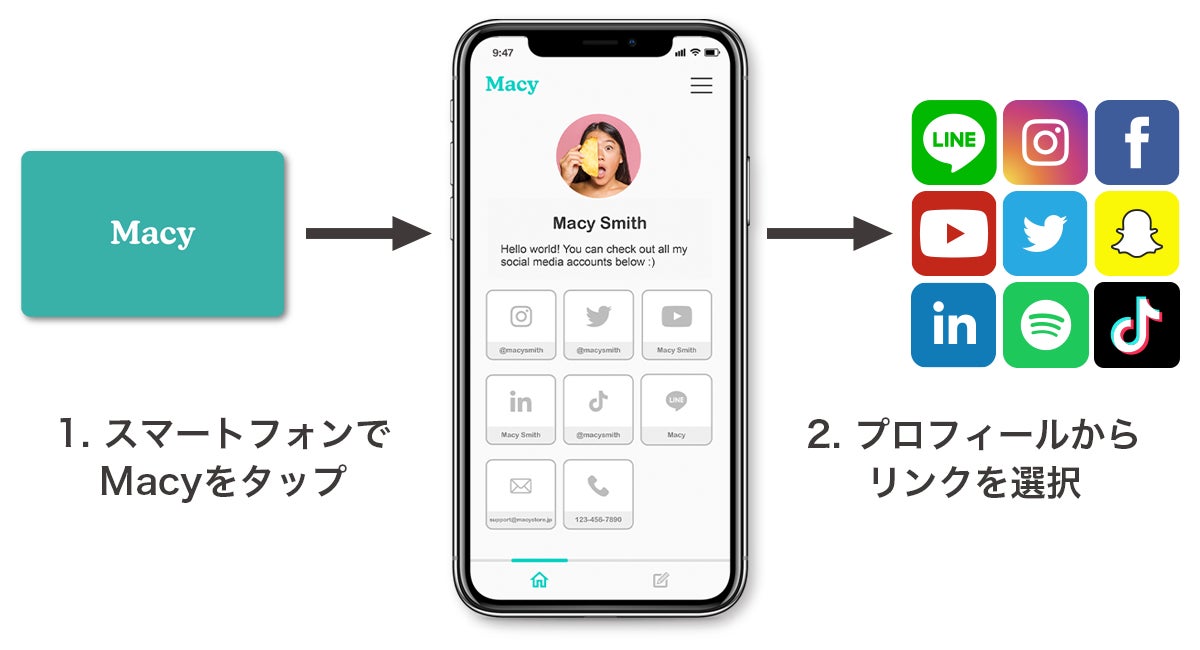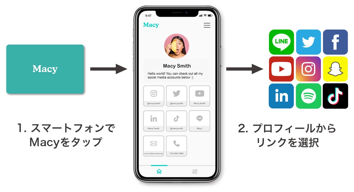 Macyで自己紹介をしましょう!スマートフォンの背面上部をあなたのMacyに近づけ、表示される通知をタップすれば、あなたのプロフィールページに誘導されます。