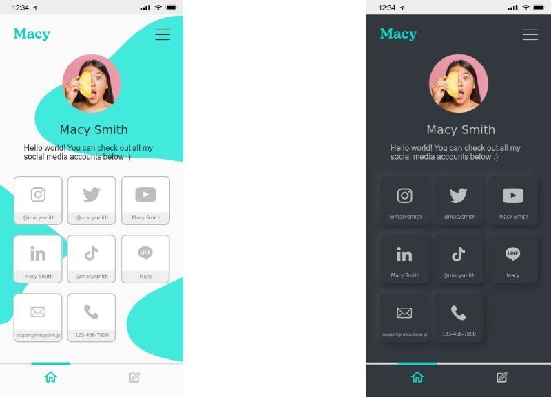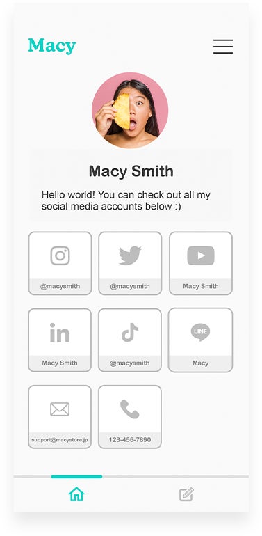 カードを購入された方のみ、『Macyアカウント』へ登録することができます。簡単な登録後にあなたが友達やクライアントに共有したい情報を追加し、プロフィールページを用意しましょう。Macyアカウントはウェブサイトなので、アプリをダウンロードする必要はございません。以下がプロフィールページのイメージです。