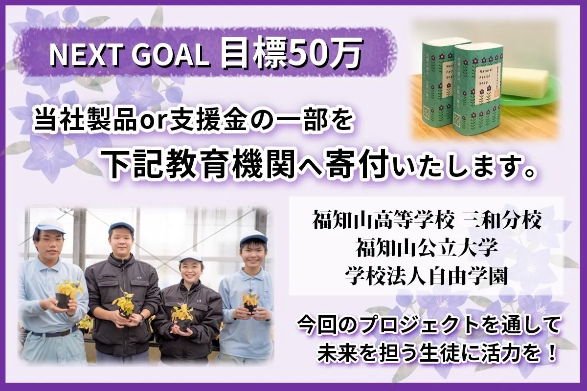 生徒の皆さんが育てた桔梗を使い、ブランドの立ち上げと商品化をさせていただいた御礼の気持ちを込めて、完成品を福知山高等学校 三和分校の関係者の方に向けて寄贈したいと考えております。より多くの数量を確保に向けて、ネクストゴールの対象とさせていただきました。