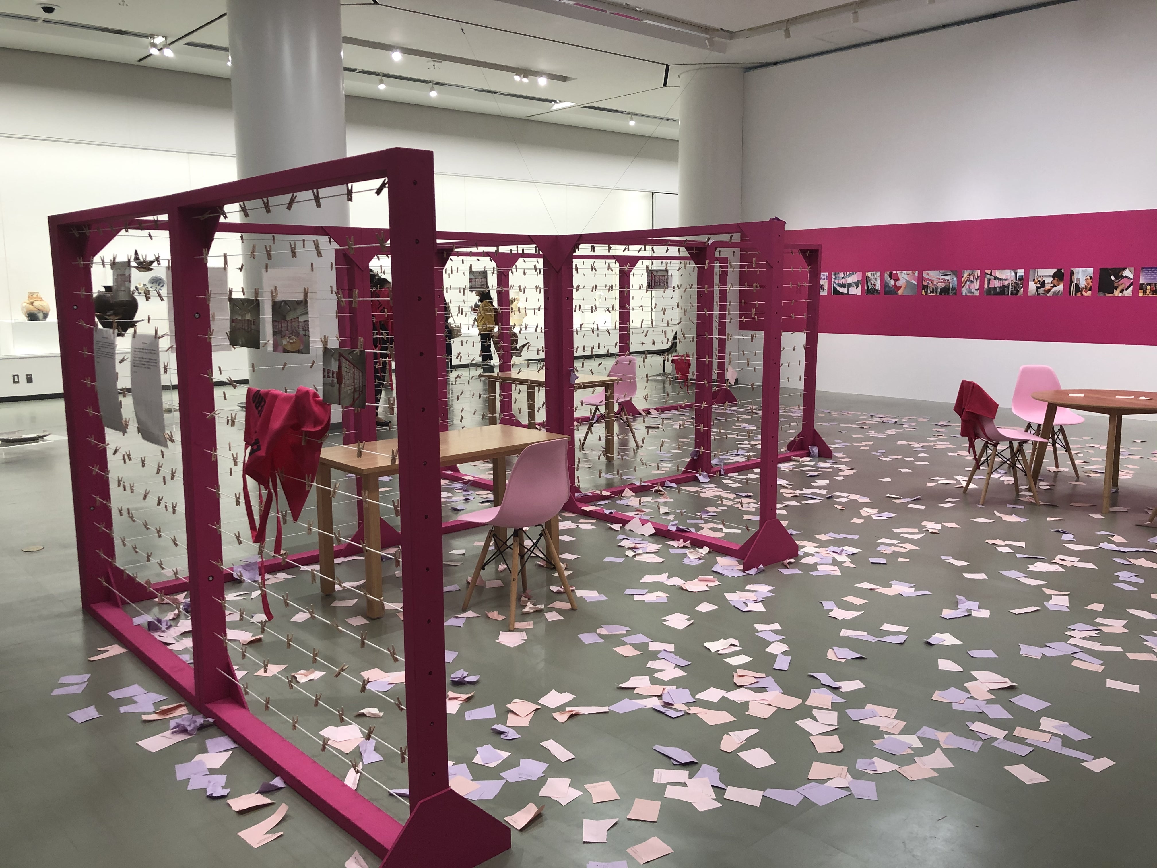 「The Clothesline」は、メキシコのフェミニストアーティストであるモニカ・メイヤーによる作品の一つで、日常の中の格差や差別などの社会的に表に出にくい「声なき声」を拾い上げ、社会課題を見える化します。「The Clothesline」の特徴は、展示されている用紙やフレームだけが作品なのではなく、それまでの経緯(今までの歴史を学んで質問を作ったり、ワークショップをしたり)や、その場で交わされた対話など、そこに関わる全てのストーリーが作品であること。このようにアーティストが対話や討論、コミュニティへの参加や協同といった実践を行なうことで社会的価値観の変革をうながすことをソーシャリー・エンゲイジド・アートと呼びます*。