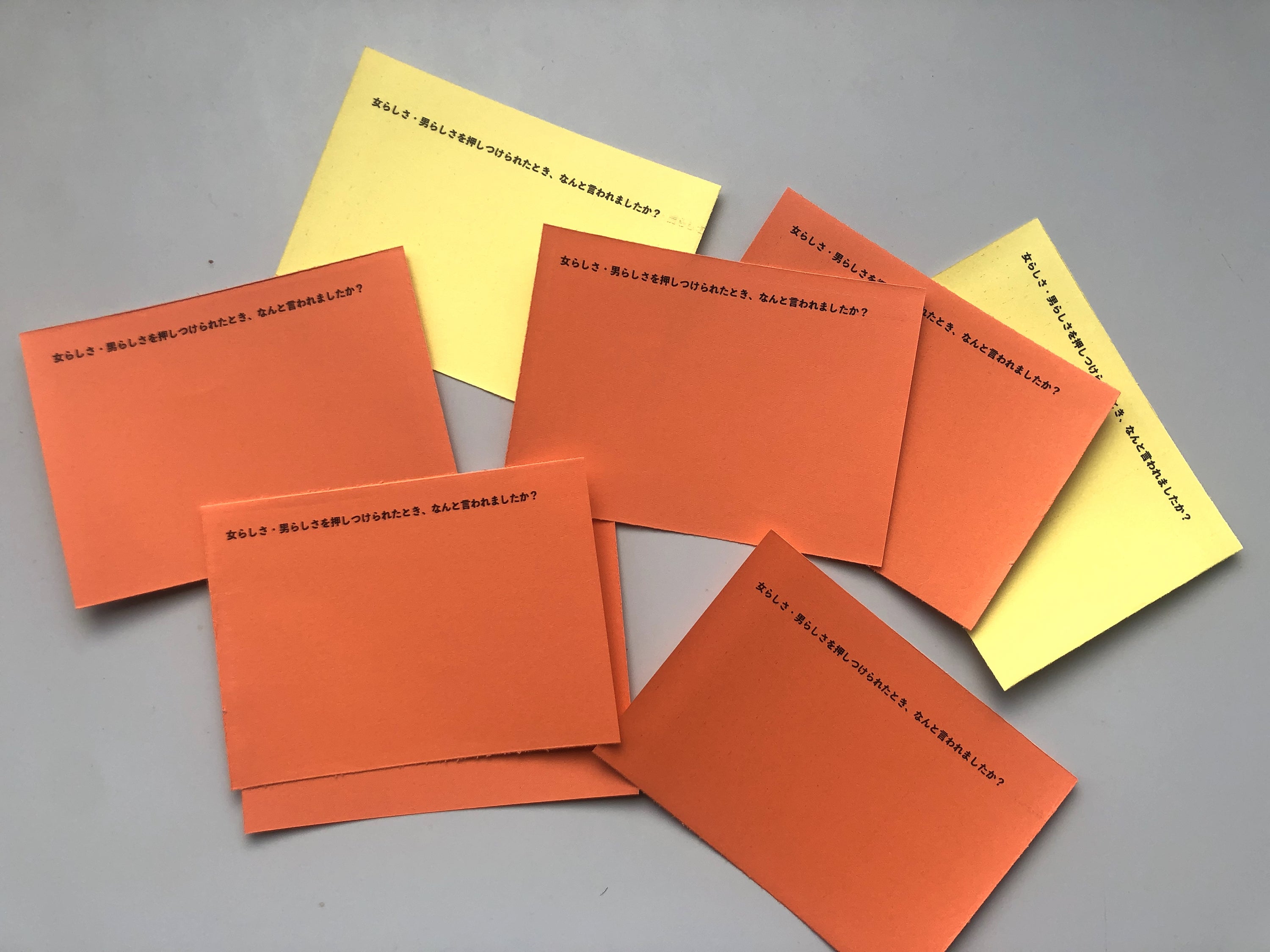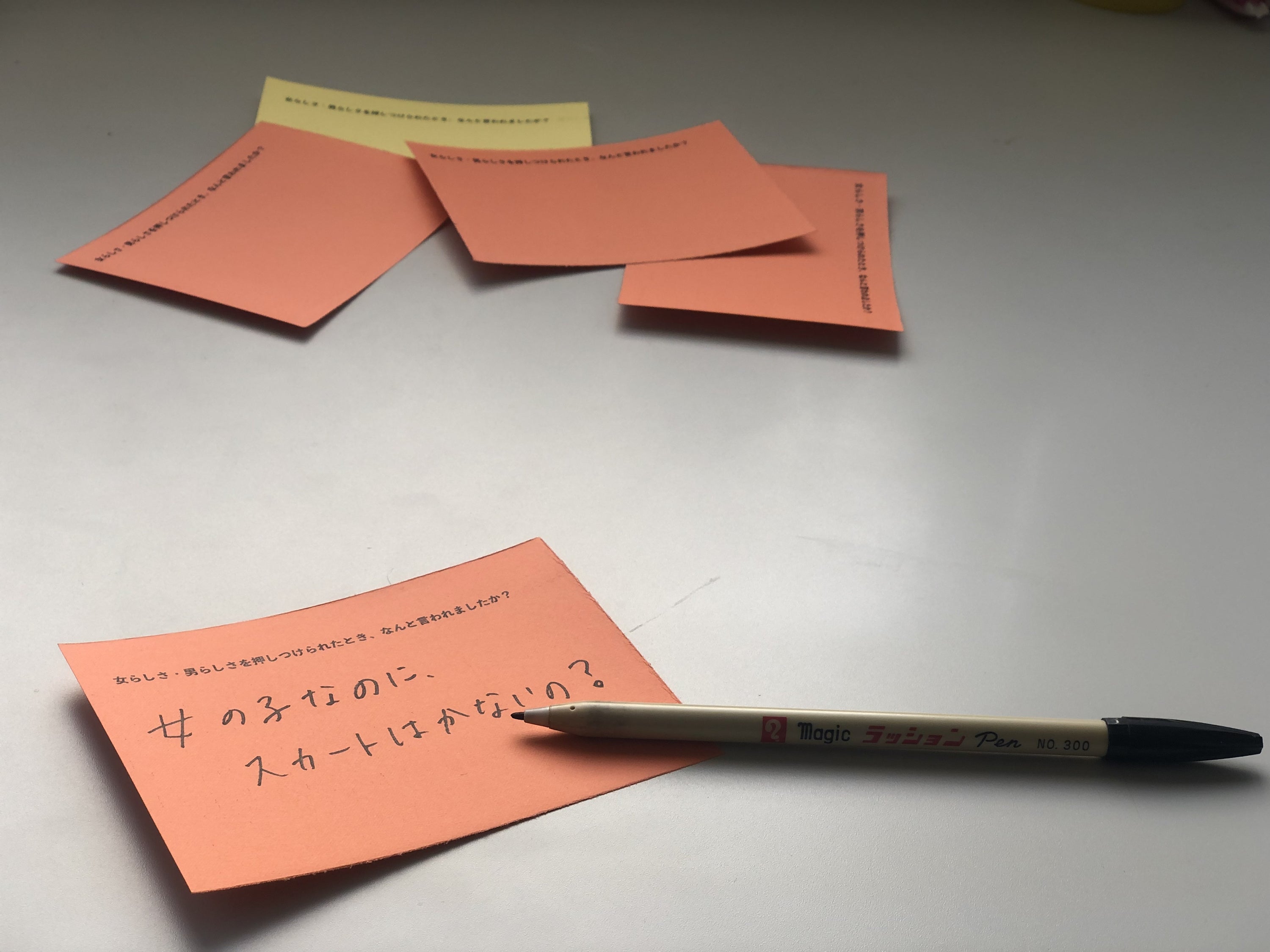 テーマは「女らしく、男らしく。だれかの常識は、わたしにとっての非常識。」。会場ではテーマに沿った4つの質問を用意します。例えば「女らしさ・男らしさを押しつけられたとき、なんと言われましたか?」。来場者が答えを書いたカードをアート作品として掲示します。