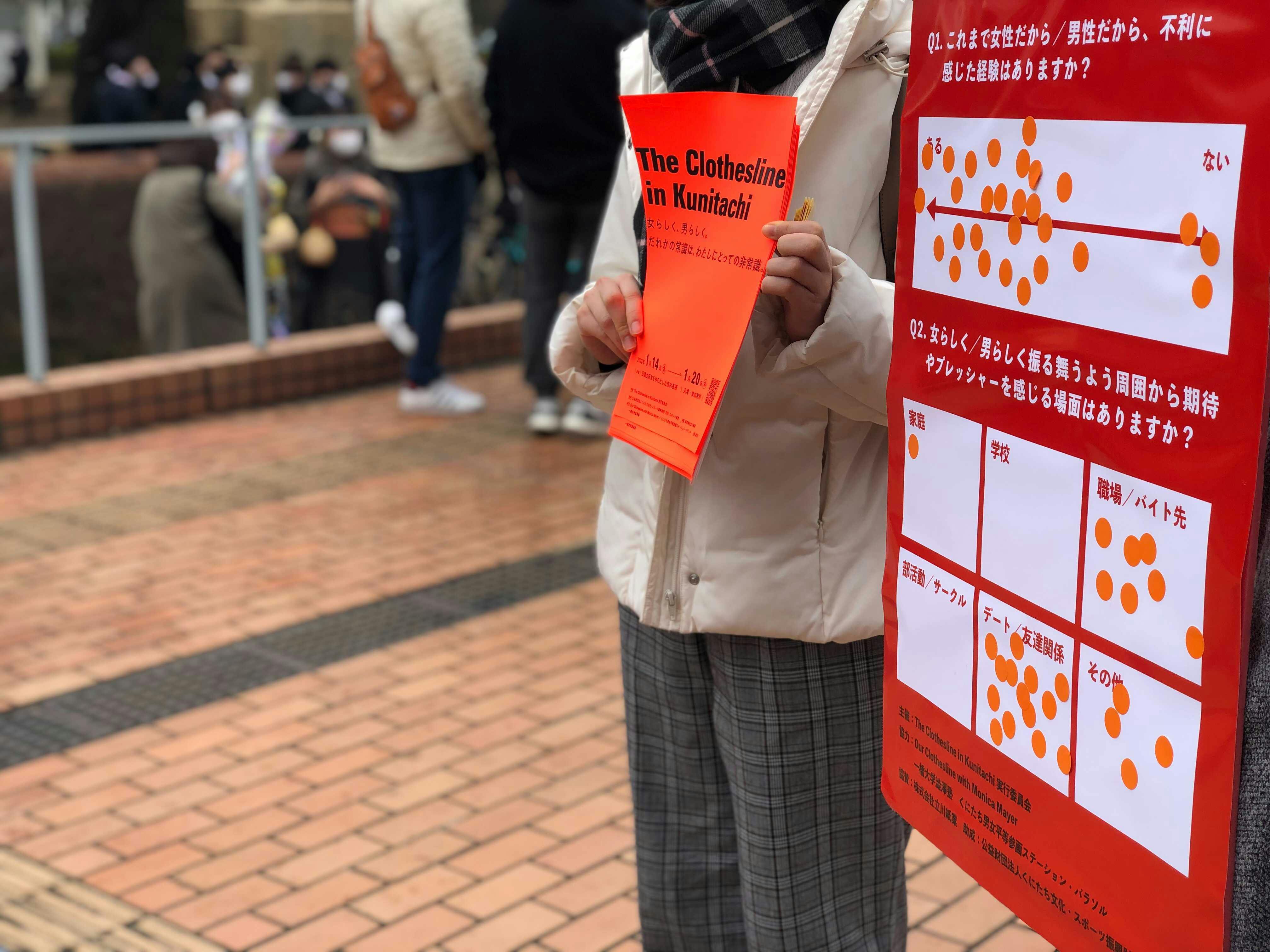 2022/01/11 13:29The Clothesline in Kunitachi 開催が目前に迫っております。2022年1月10日(月)は成人式!ということで、国立市の新成人の皆さんにも女らしさ、男らしさについて聞いてみました。会場であるくにたち市民総合体育館の前で質問1)これまで女性だから/男性だから不利に感じた経験はありますか?質問2)女らしく/男らしく振舞うよう周囲から期待やプレッシャーを感じる場面はありますか?という看板にシールを貼って、回答!皆さん快く答えてくださいました!最終的には140名もの新成人に回答いただきました。結果はこちら。ありがとうございました!!そして新成人の皆様おめでとうございます!!こちらはThe Clothesline in Kunitachi の関連イベントWelcom to The Clotheslineとして開催したものです。 もっと見る