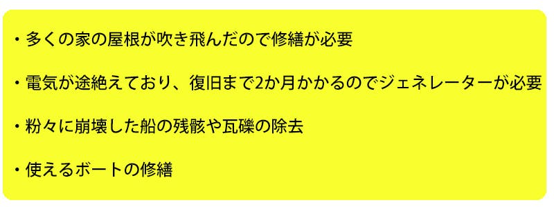 2022/01/27 07:00マクタン島のマリバゴのボートのオーナーは36人。所有ボートは計68隻。そのうち63隻が壊れました。コルドバのボートオーナーは24人。所有ボートは計40隻。そのうち38隻が壊れました。オランゴ島にはボートのオーナーは80人。所有ボートは計200隻。そのうち180隻が壊れました。マリバゴのボート協会やコルドバの市長を含めた会議を現在多数しており、どうするかを日々話し合っています。現地でもがんばっております!セブ島復興支援のクラウドファンディングは1月31日、まもなく終了してしまうので、是非最後の応援をいただけたらと思います。 もっと見る