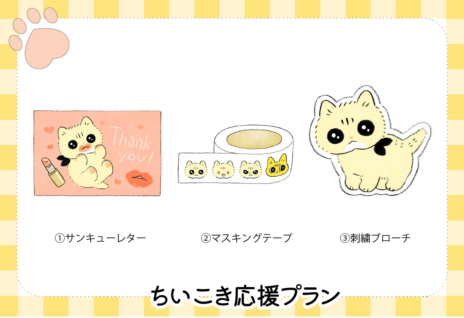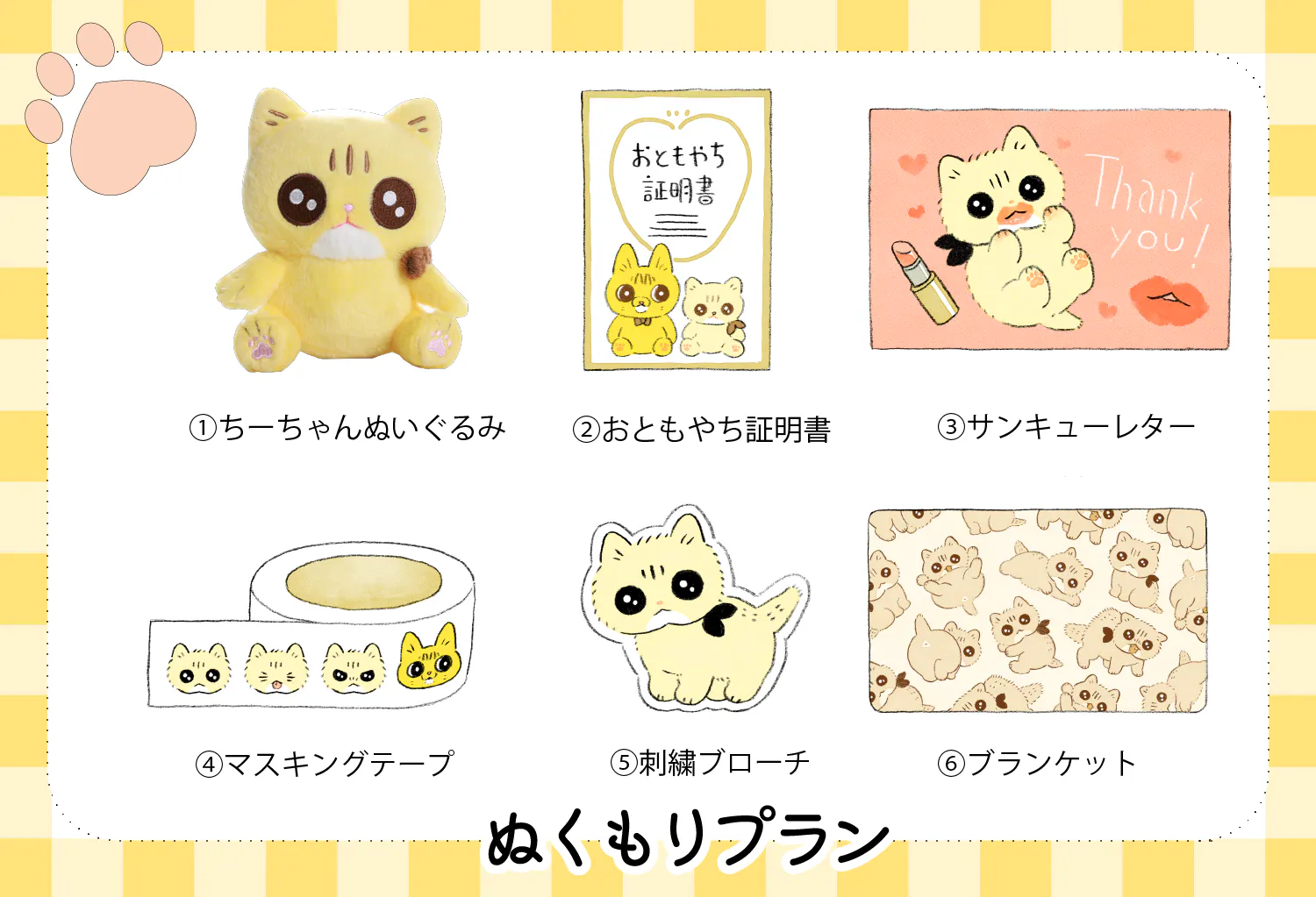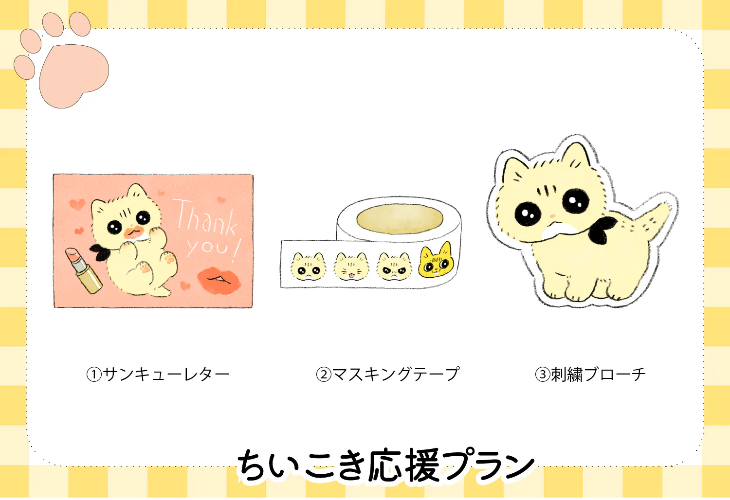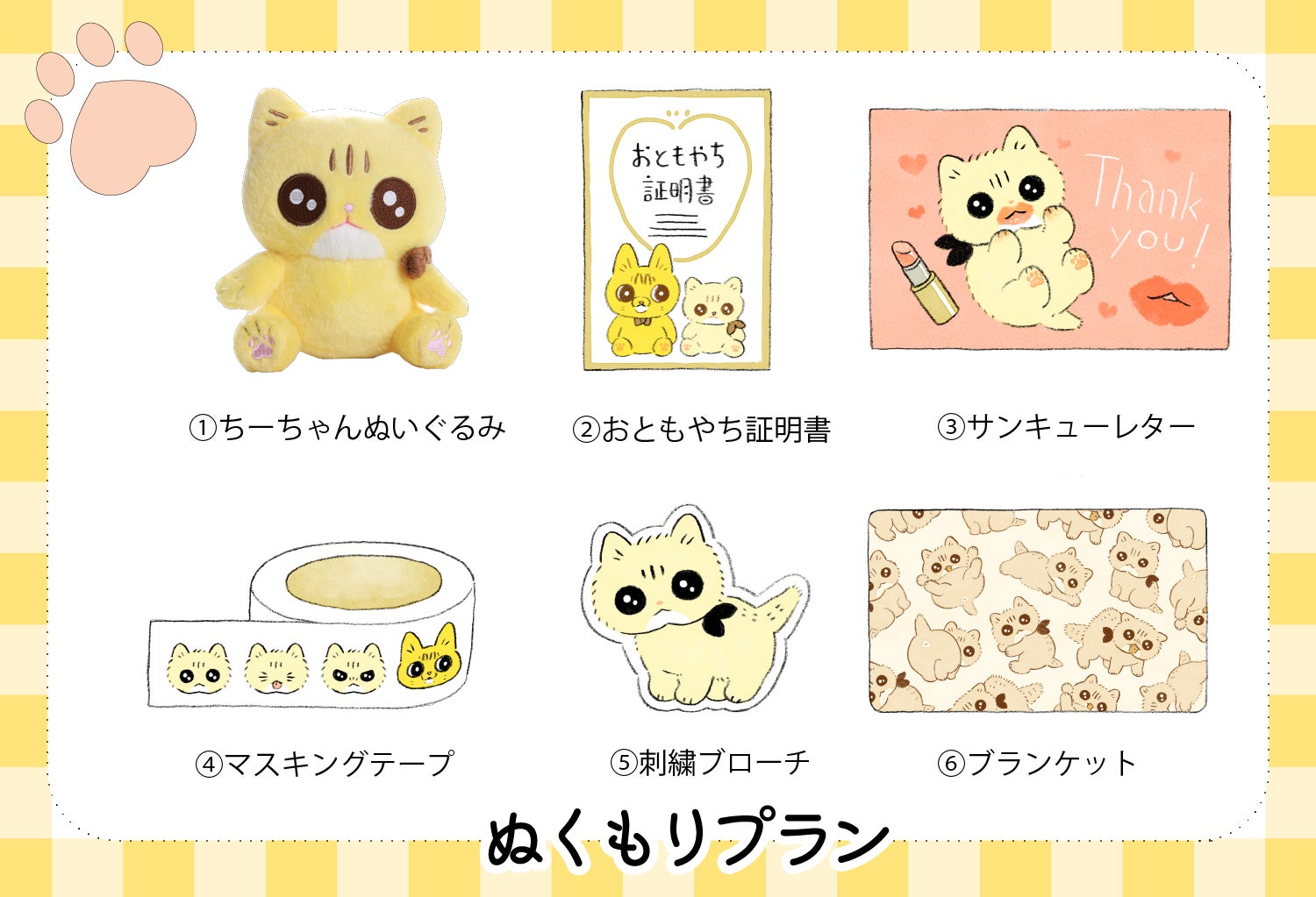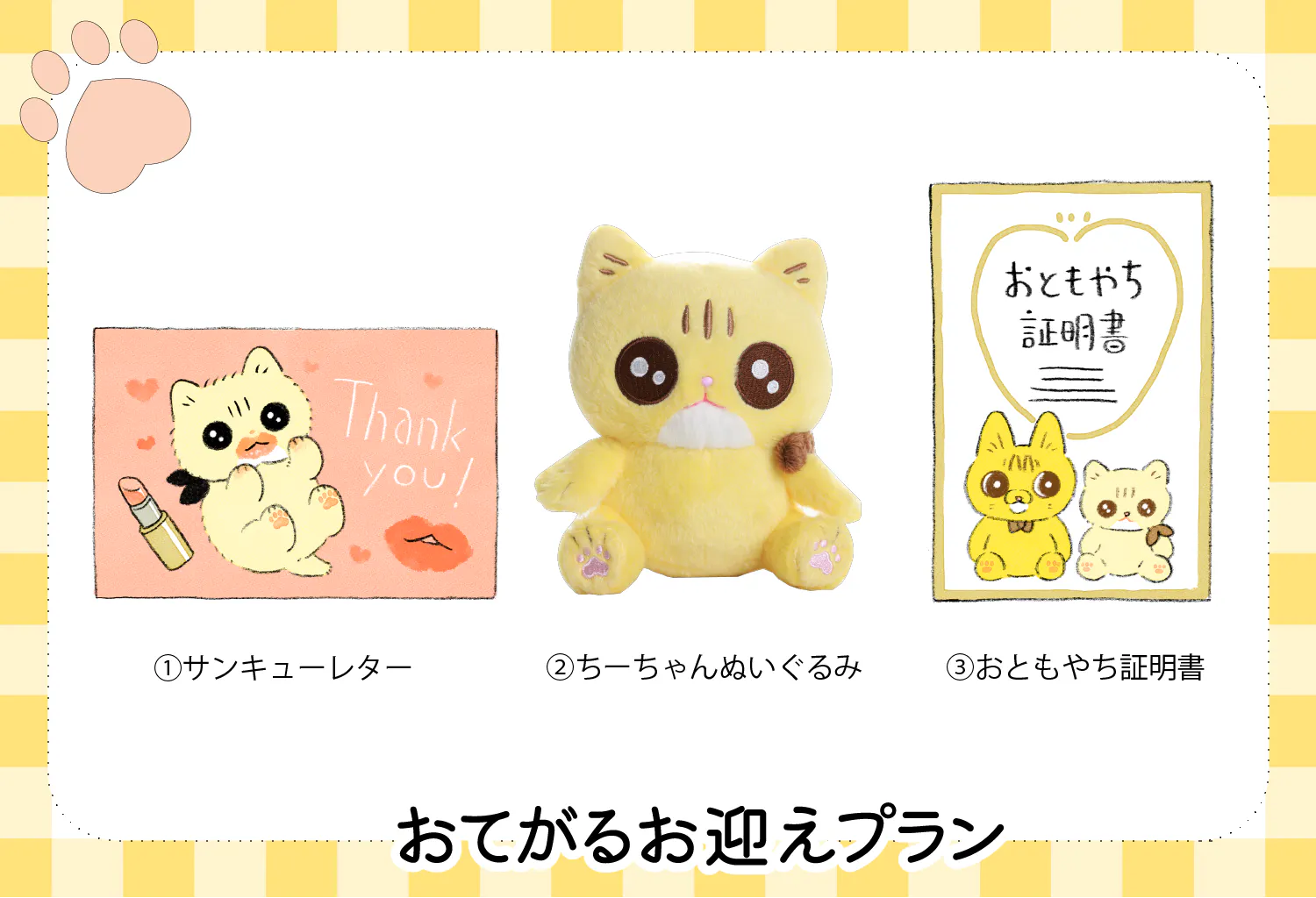 ちーちゃんのぬいぐるみとクラウドファンディング限定のグッズをお届けします。