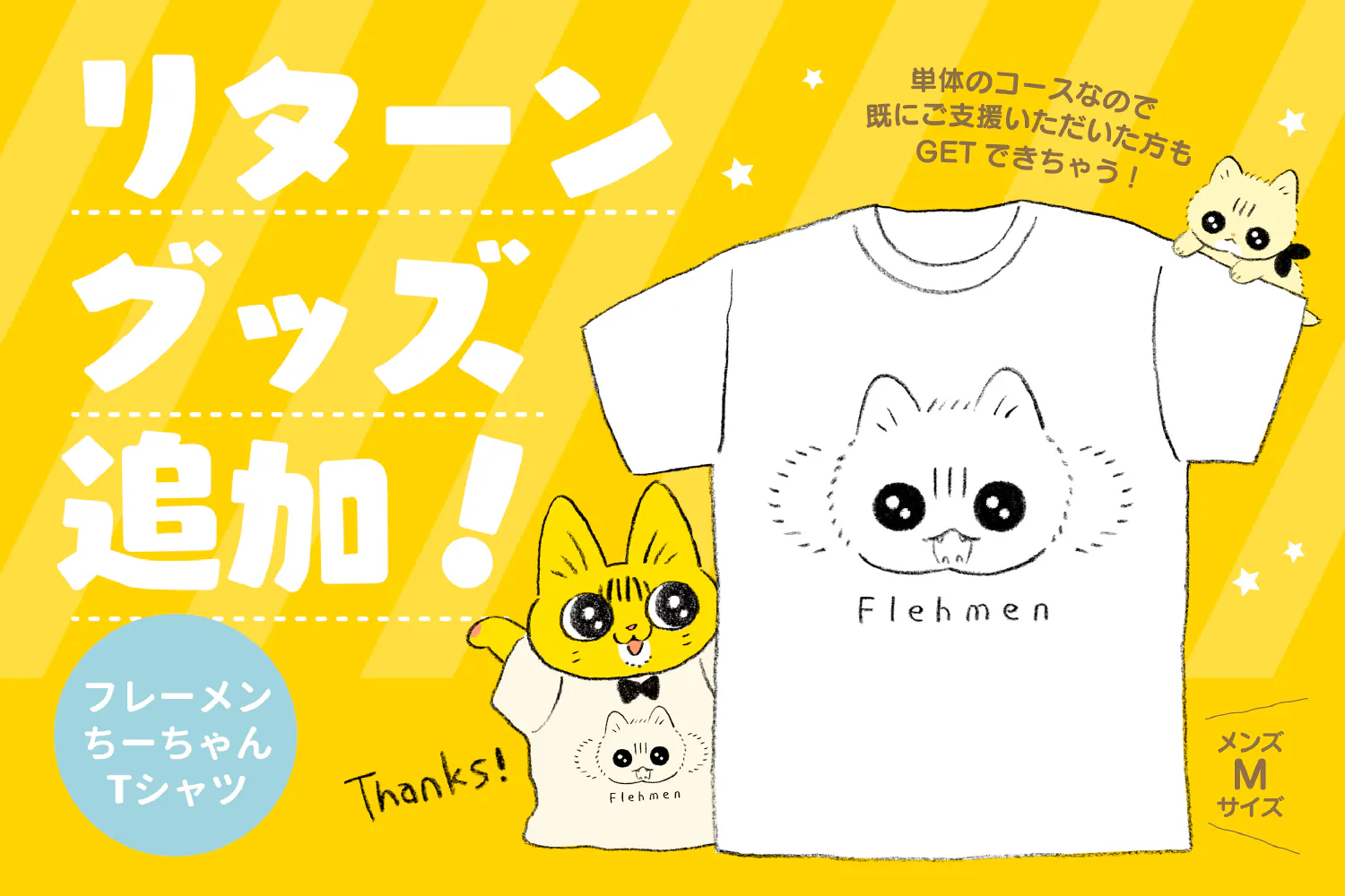 2022/02/17 17:39「子猫のちーちゃんプロジェクト」を応援して頂き大変ありがとうござます!・皆様のご支援に感謝の気持ちをこめて新たにリターンを追加しました【フレーメンちーちゃんTシャツ】類さん書き下ろしで、やっちゃんとお揃いのTシャツになります!※デザインはプリント印刷です。※サイズはメンズM、ワンサイズでのご用意です。支援金額は5750円になります。Tシャツ単体のリターンになりますので既に他のプランにご支援頂いた方にもご支援頂けます!残り7日間となりますが、ちーちゃんのプロジェクトの方引き続き応援お願い致します。 もっと見る