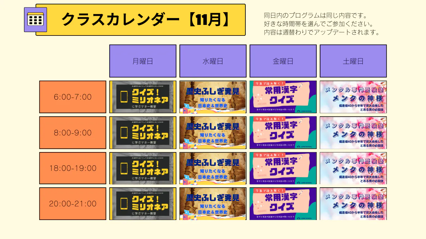 2022/10/23 09:0011月のクラスコンテンツをアップデートしました。クイズシステムを拡張して1クラス100名までライブクイズが楽しめる仕様に変更しました。10月に配布させていただいたリターン用のクーポンは11月分も使えるのでよろしければ引き続きご参加ください。https://www.living-school.com/ちなみに11月ラインナップにはこちらです。月曜 「クイズ!ミリオネア」 お金持ちはどうしてお金持ちになったのか。クイズ!ミリオネアに学ぶマネー教室水曜 「歴史ふしぎ発見」 暗記科目と思っていたけど、今日から知りたくなる日本史&世界史ミステリー金曜 「常用漢字クイズ」 字源で読み解く常用漢字。漢字と英語を語源からクイズにして言葉マスターを目指します土曜 「メンタの神様」 メンタル専門受験教室。偏差値40から半年で京都大学に合格した必殺技メンタル術を伝授(それぞれ朝6時〜/朝8時〜/夜18時〜/夜20時〜の各1時間ライブ教室で内容は週替わりです) もっと見る