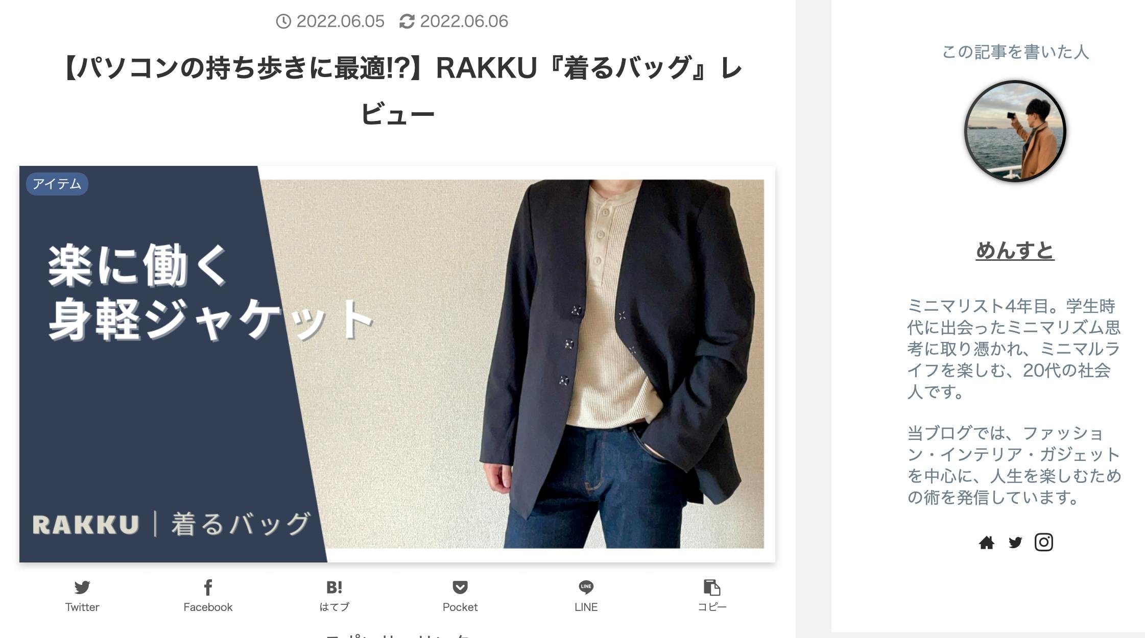 めんすと様が運営されているブログ「ミニマる推進部」に、着るバッグのレビュー記事が投稿されています。