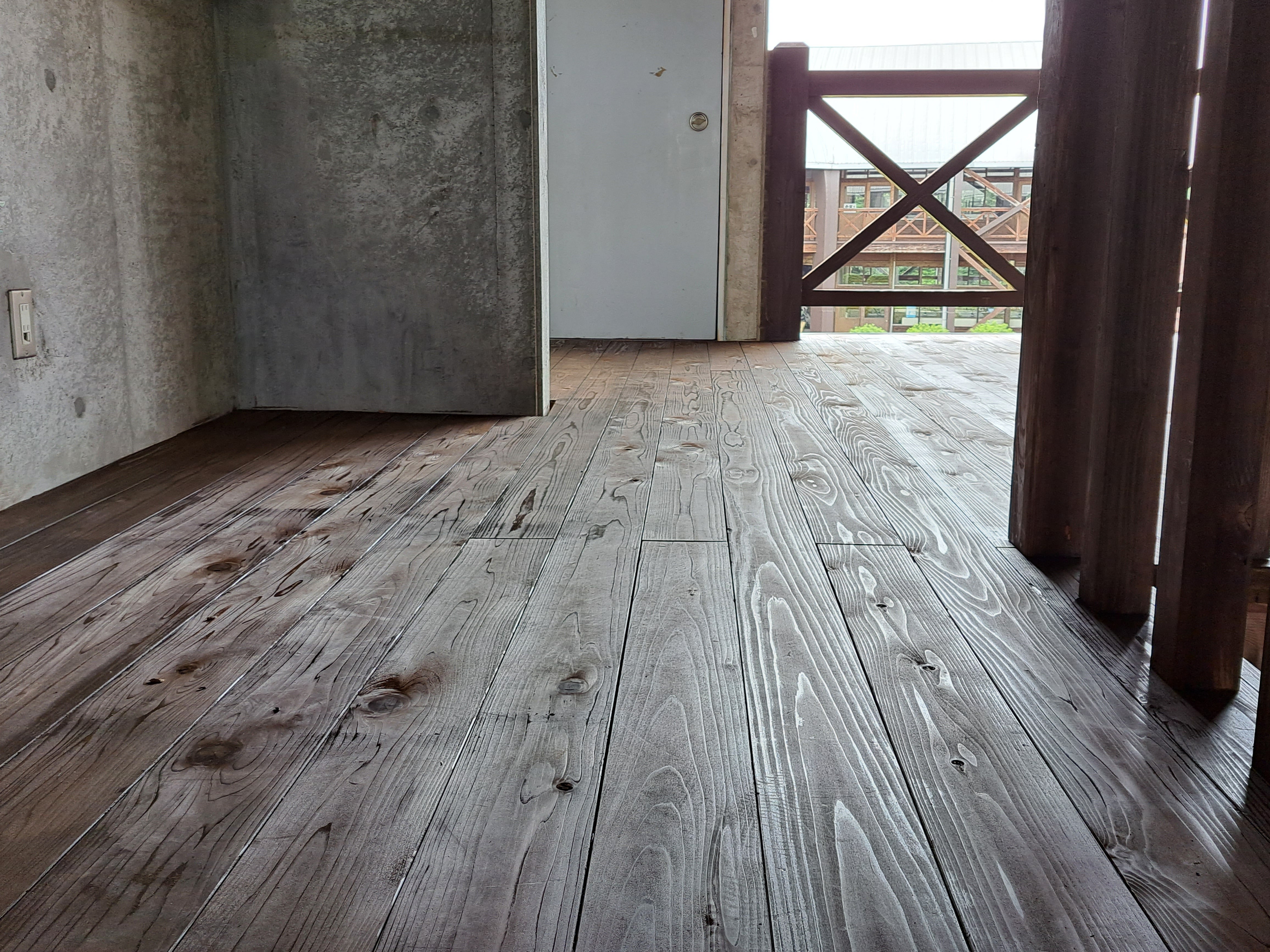 朽ちて穴が開いていたり、継ぎはぎだったりしていた2階の廊下をすべて新しい板に張り替えることができました。暑い中休みなく工事していただいた業者の皆様にも本当に感謝しています。