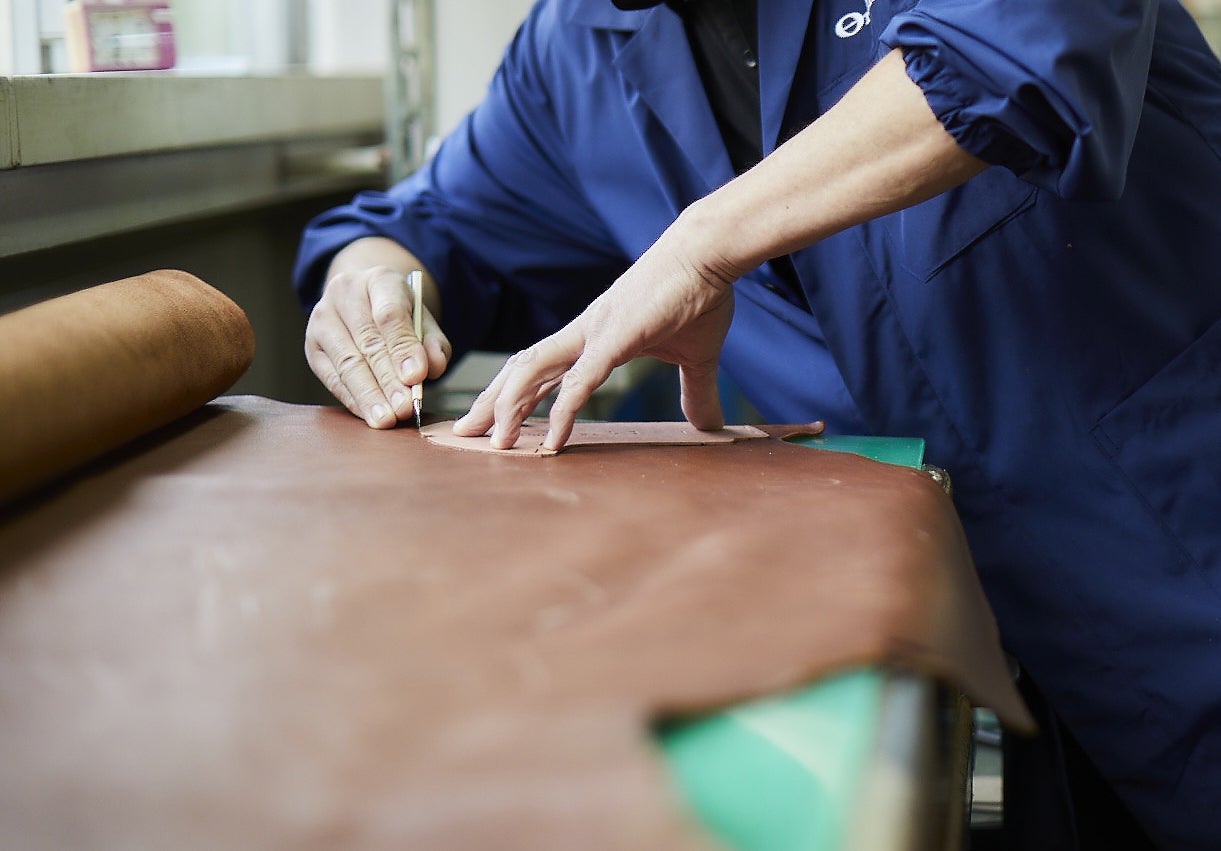 タンナーから革を仕入れた後、自社で手裁断を行っています。