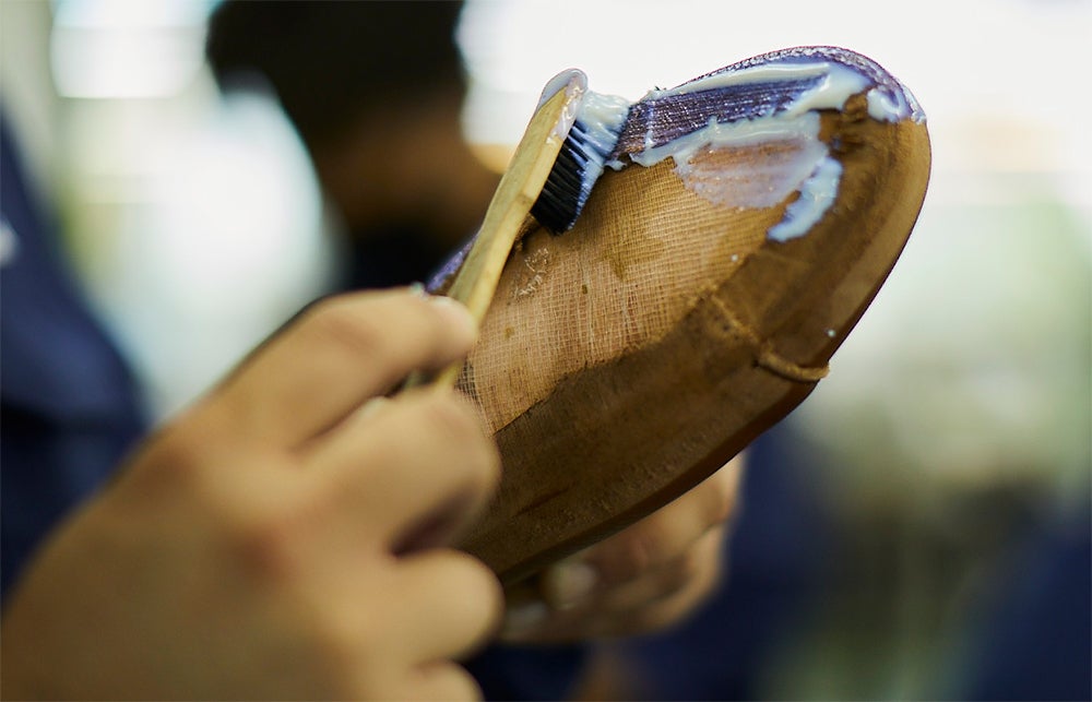 ヒトと環境に優しい植物タンニンなめしを国産家畜から生まれる牛皮に行い、何度も試作を繰り返して厚みがありながらも究極に柔らかく、しっとりした革(ボタニカルレザー)を開発することができました。靴で使用する厚みのある牛革は一般的には2㎜ほどですが、このボタニカルレザーは3㎜厚の日本の家畜牛である赤牛の革を使いながらも、驚くほどしっとりとした柔らかい革に仕上げています。