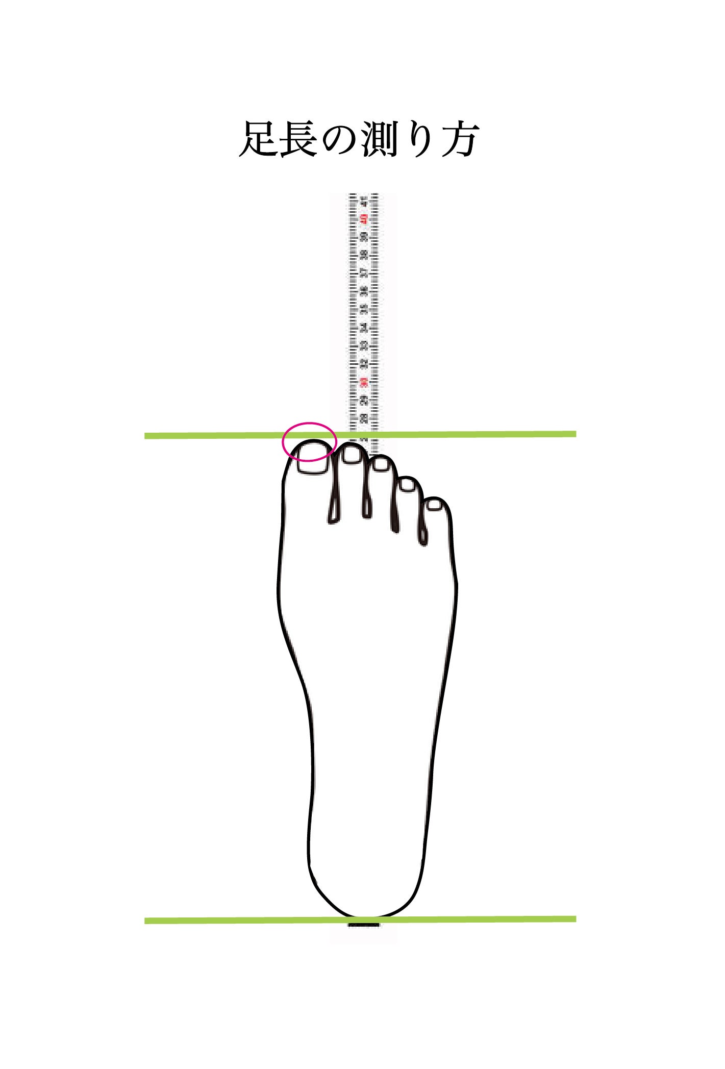 平らな地面にメジャーを真っ直ぐに引いて、その上に真っ直ぐ立ち、かかとの1番出ている部分からつま先の1番出ている部分(人によって違いますが下図は親指です。)までの長さが足長です。