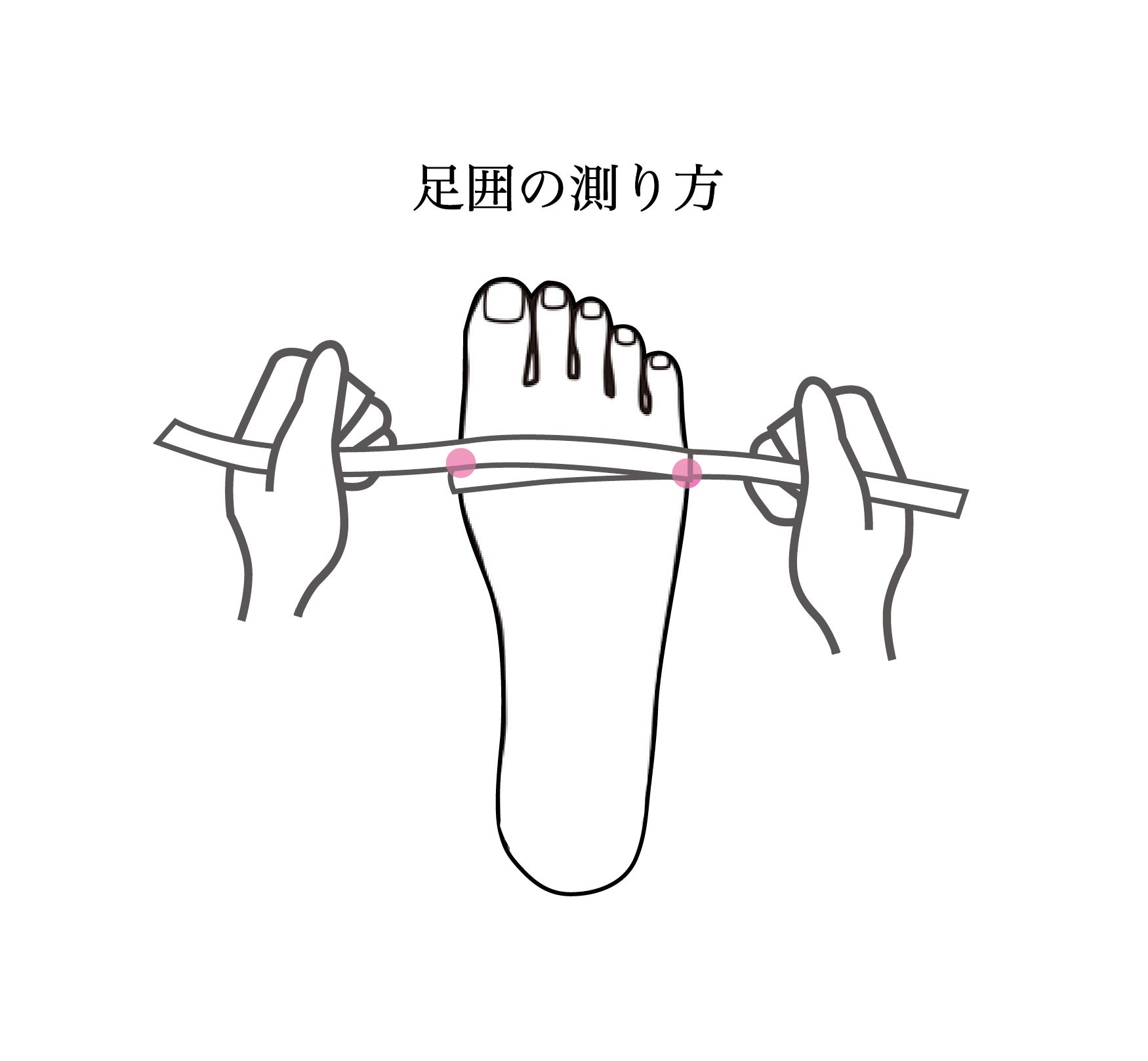 平らな地面にメジャーを真っ直ぐに引いて、その上に真っ直ぐ立ち、親指の関節の1番出ている部分(赤丸左)と、小指の関節の1番出ている部分(赤丸右)に合わせてメジャーで周囲の長さを測ります。