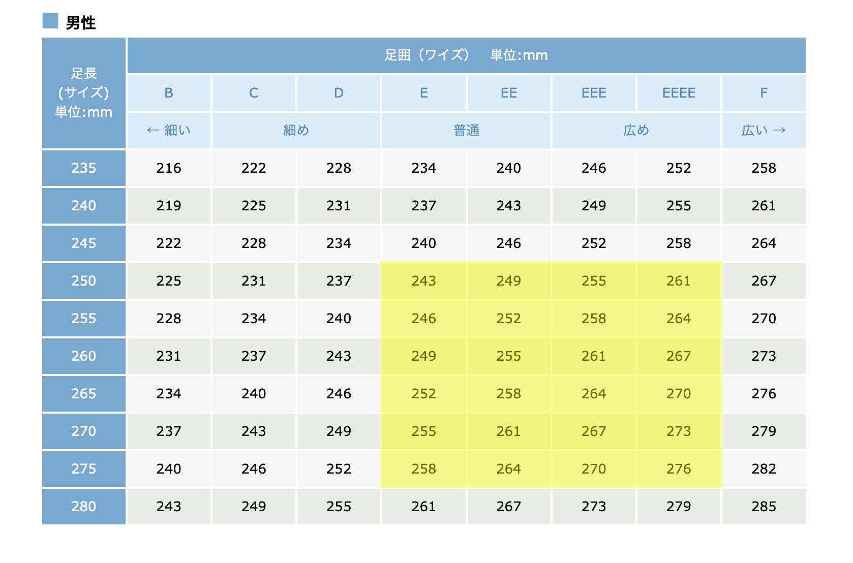 人それぞれに足の形状等も違いますので、上図の適用範囲内、適用範囲意外の計測数値でも着用可能な場合がございます。何卒ご了承ください。