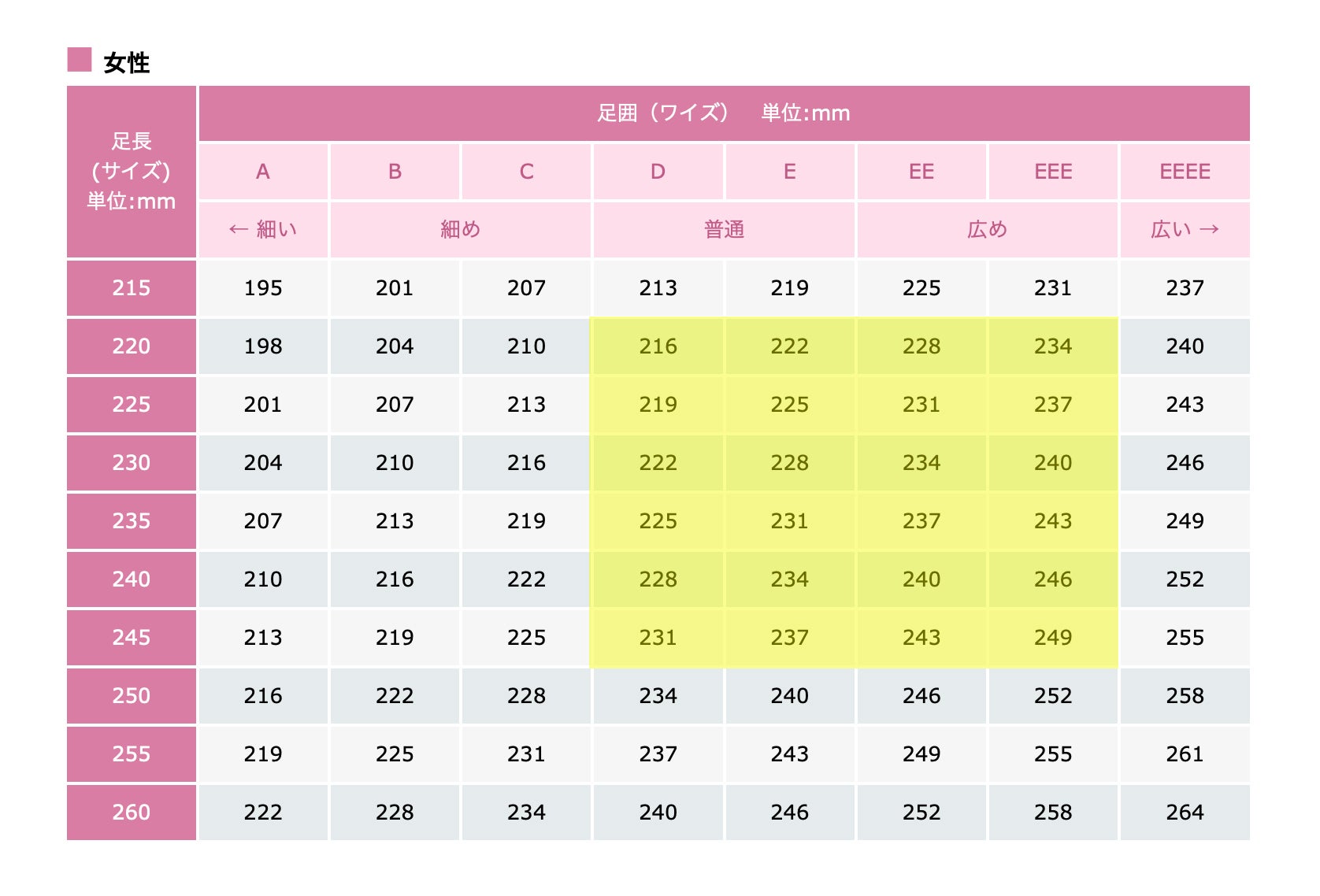 足長、足囲の計測をもとに、下記サイズ選定基準を基準にお選びください。