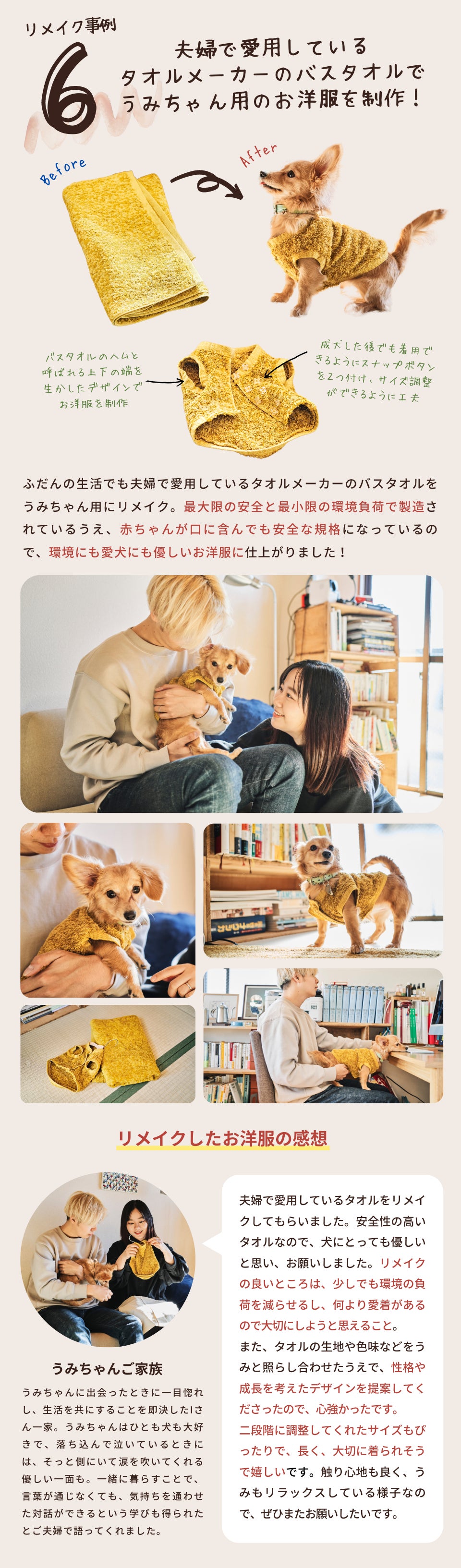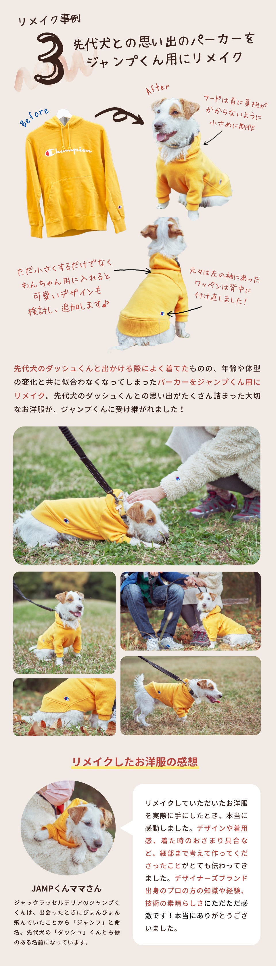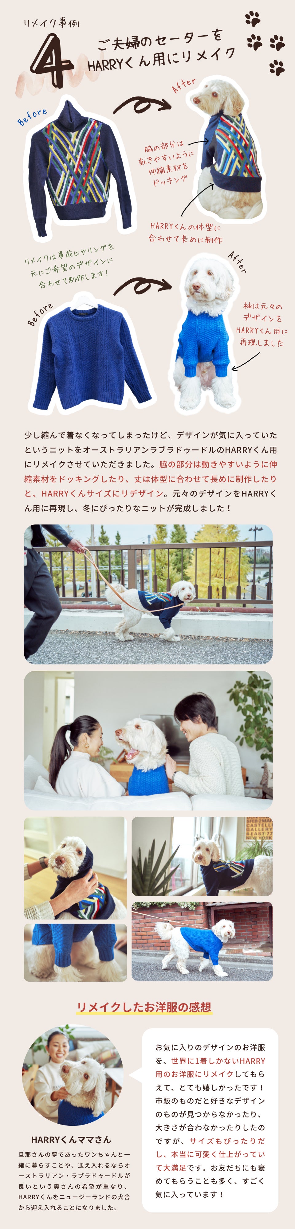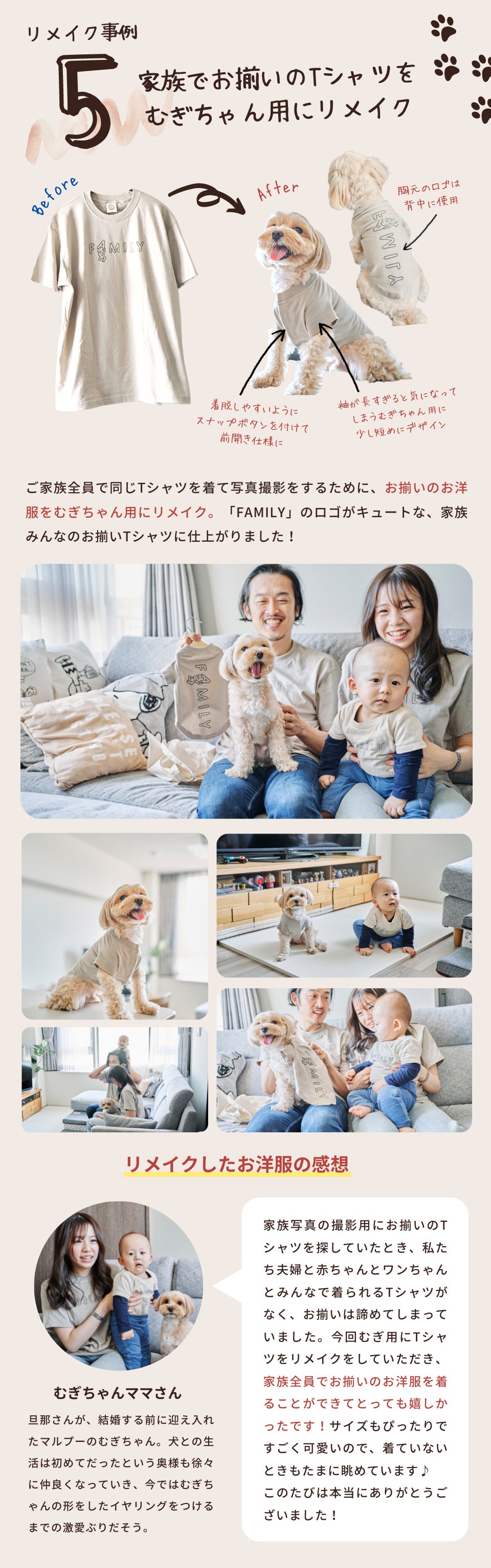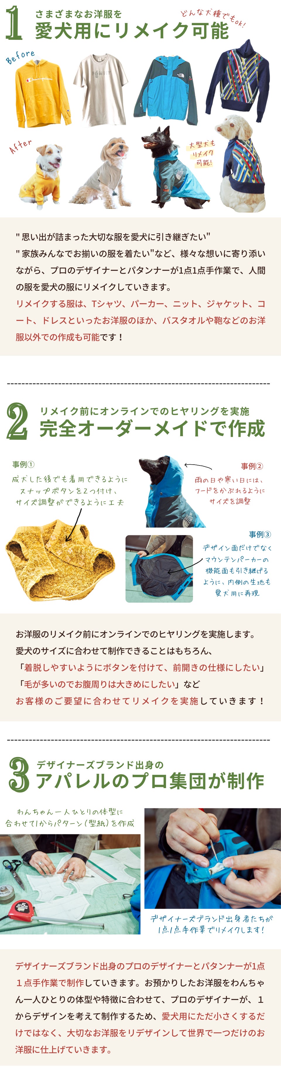 「思い出が詰まった大切な服を愛犬に引き継ぎたい」、「家族みんなでお揃いの服をきたい」など、様々な想いに寄り添いながら、プロのデザイナーとパタンナーが1点1点手作業で、リメイクしていきます。